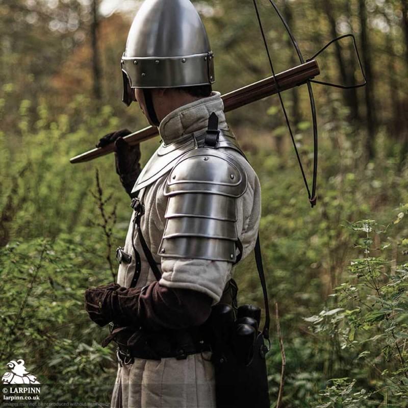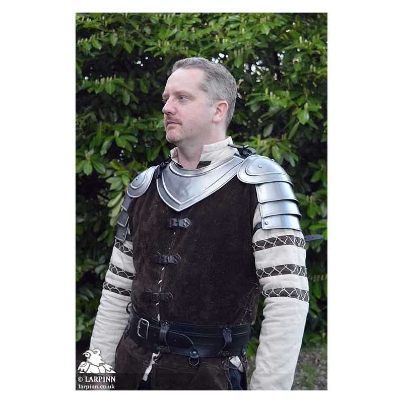 This particular set of plate shoulders very flexible with articulated three plates that move with the arm. The spaulders attach to the gorget via a single strap on both arms and have a strap that goes underneath the arm. Overall, this item makes a great option for all your larp, cosplay or theatrical costume.