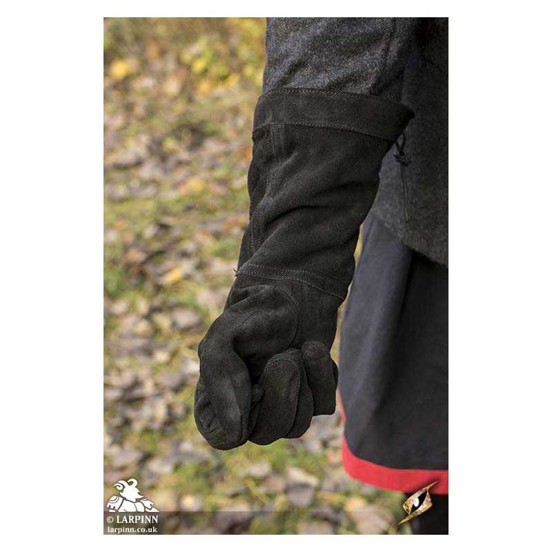 These Adventurer Leather Gloves are thick, handsome leather gloves with 15 cm long cuffs. They are made from plated, chrome-tanned leather and stitched at all joints around the fingers, wrists and edges. This stitching improves the strength of the material by preventing it from deforming with heavy use or from exposure to the environment. The fit of the gloves can be adjusted with a drawstring set through four brass eyelets on the outside of the cuff.