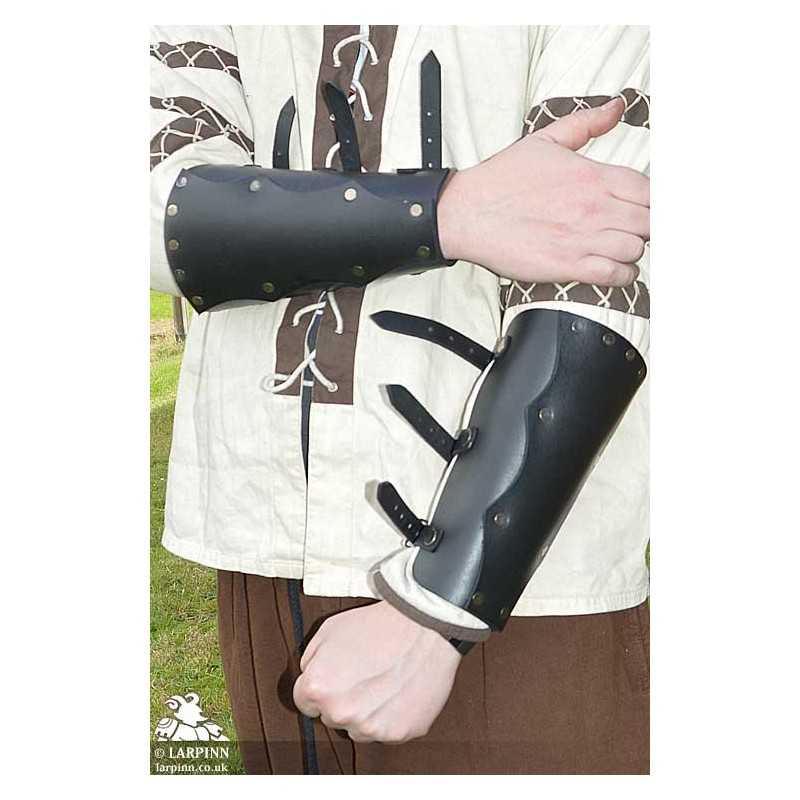 The Ajax leather bracers are rough-cut, leather bracers. The bracer is constructed from three segments of leather that are riveted together to curve around the forearm with flexibility. The Ajax bracers look great complimenting a combination of light armours or used as part of the Ajax set as medium armour for your LARP costume.