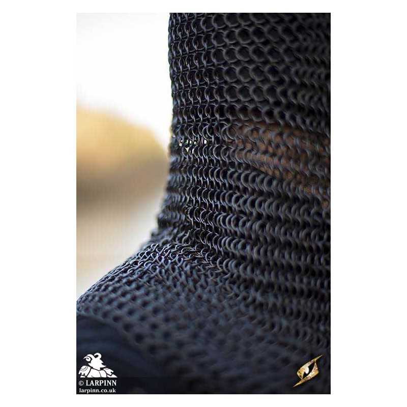 The Alaric Chainmail Hood is a flexible mail armour coif made from linked steel rings. The mail covers the head, neck and shoulders. Each butted ring interlocks with four other rings in a 4-in-1 design. Treated with Epic Armoury’s Dark Metal coat to prevent rust, you can expect this armour to last a long time as reenactment gear with proper metal care.