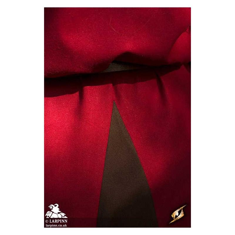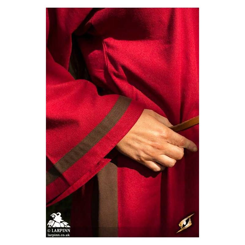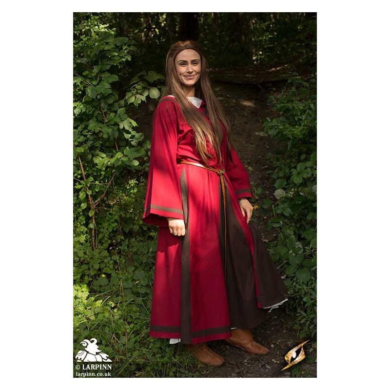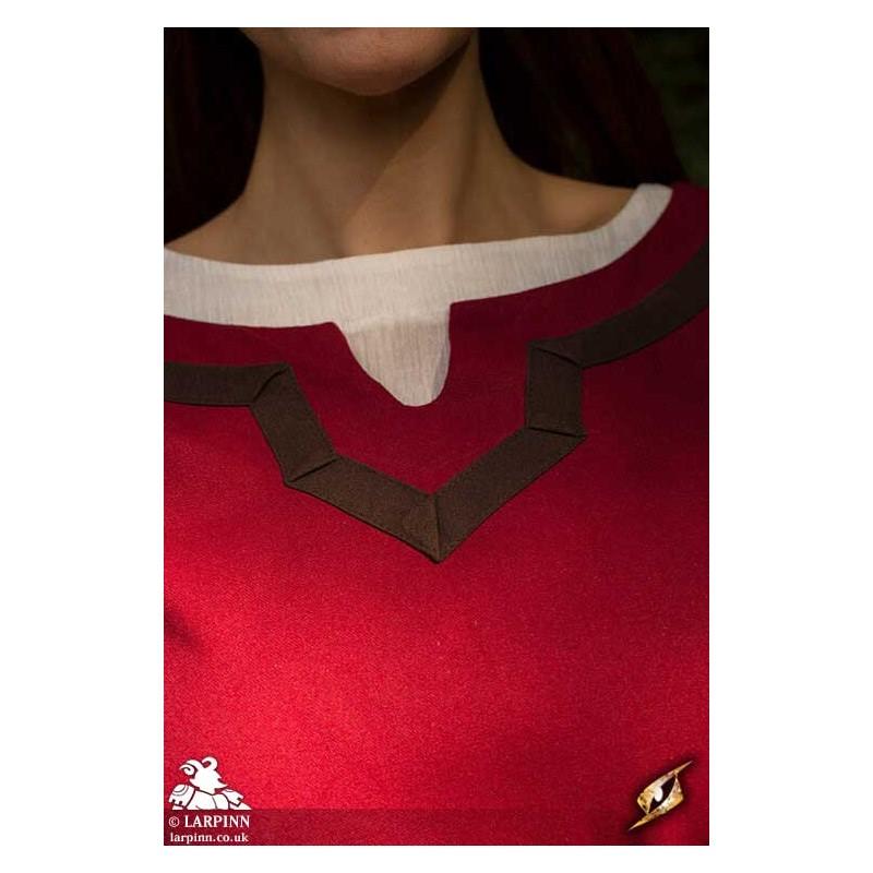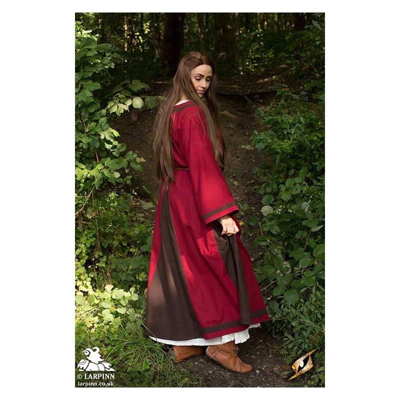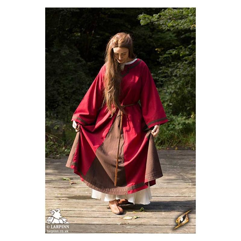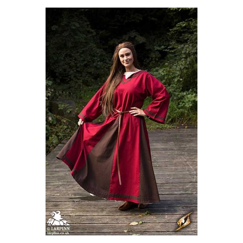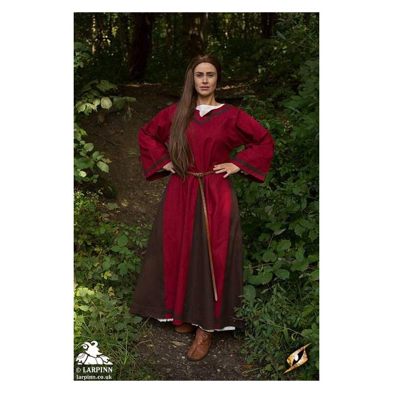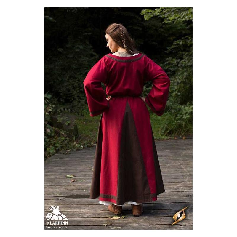 Epic Armoury's Red/Brown Dress Astrid is a scandinavian inspired slip-on dress with long bell sleeves. The V-cut neckline, wrists, and skirt are trimmed with a contrasting brown ribbon. Made from durable, medium canvas cotton, this dress reaches from the shoulders to the ankles and has a comfortably wide blue and brown gusseted skirt to allow for easy movement.
