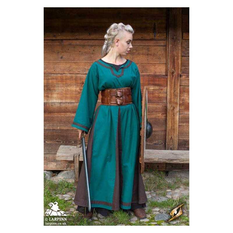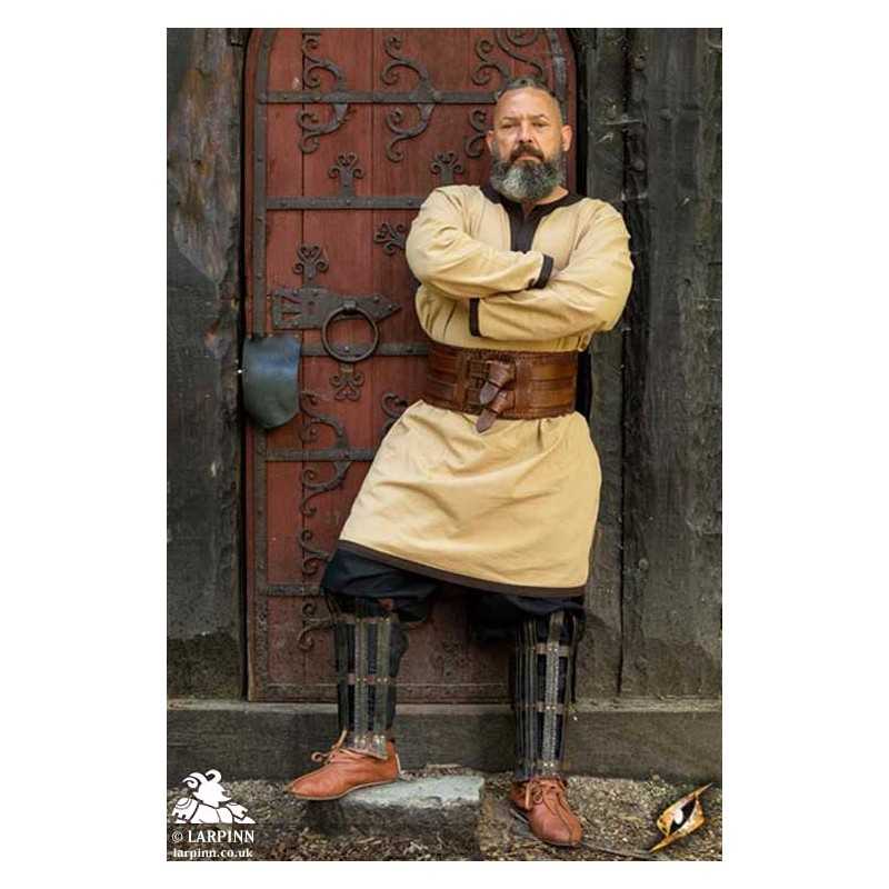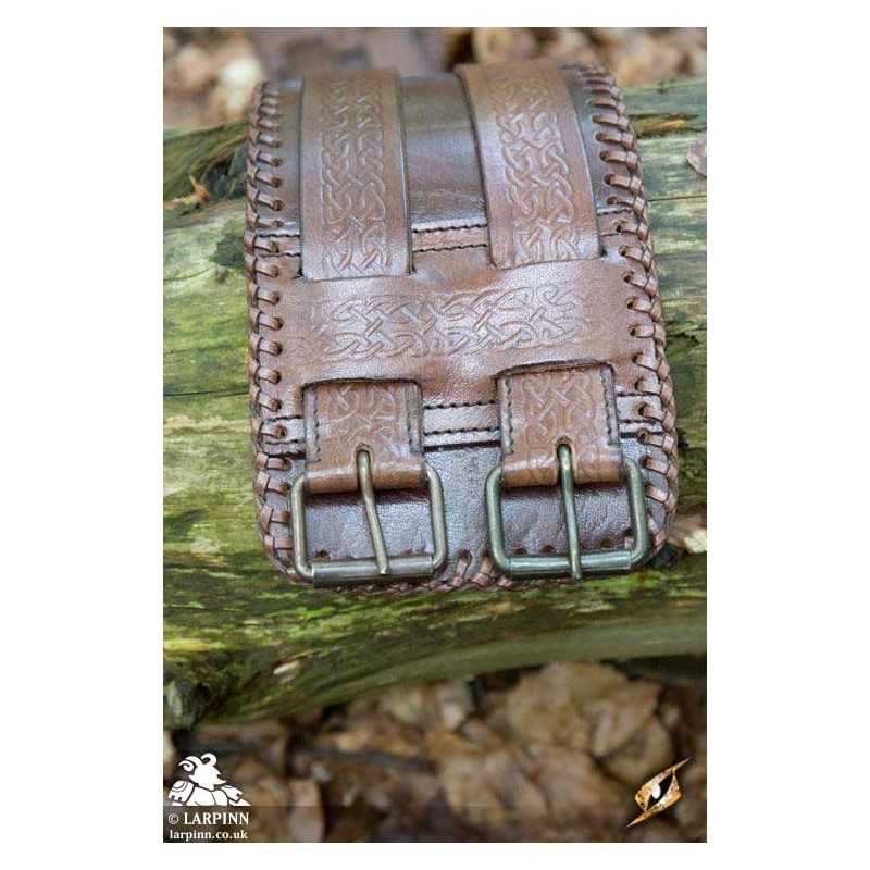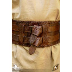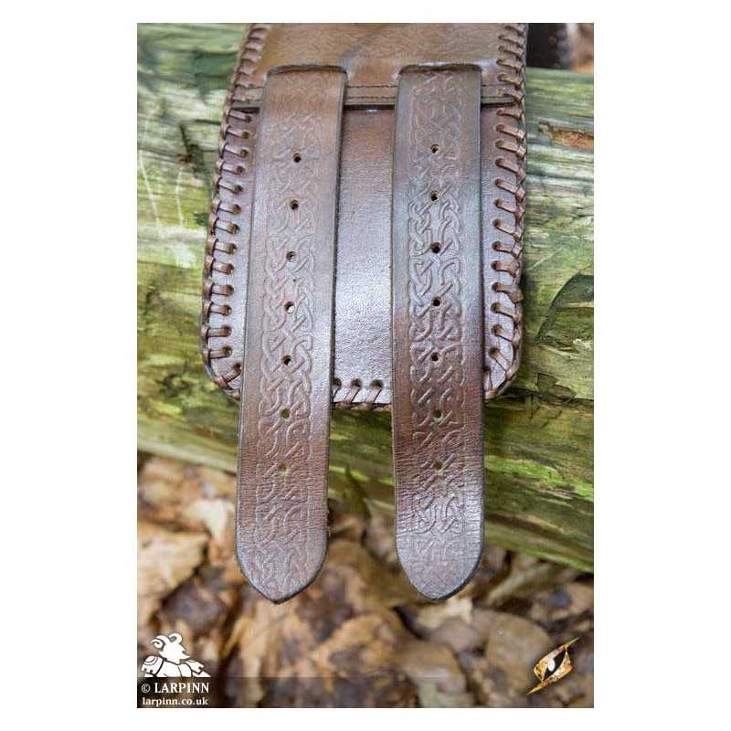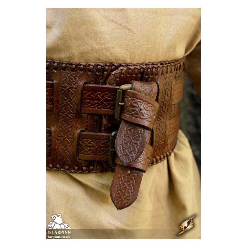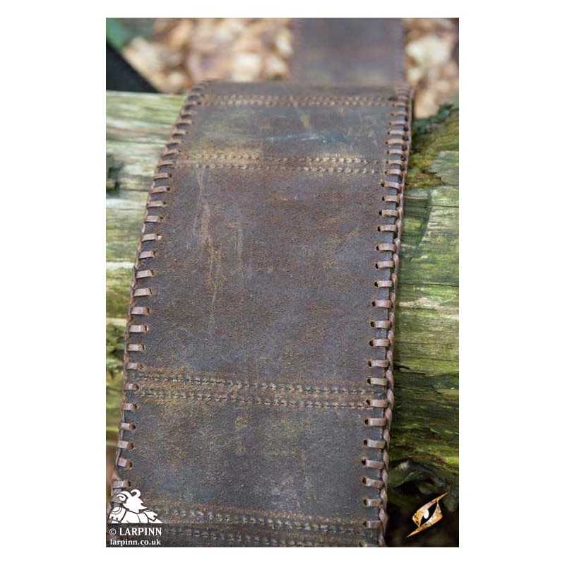 The Barbarian Belt is an impressive leather kidney belt embellished with beautiful designs and laced edges. The belt is made from two smaller, embossed leather belts slipped through a wide brace, providing a secure fit that will remain fixed over your costume. This design also allows you to attach heavy weapon holders and bags, supporting extra weight with ease. Aesthetically, the belt has rustic detailing with laced stitching that gives life to your costume.