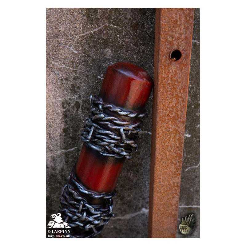 This 80 cm long Barbed Wire Bat has a 17 cm handle wrapped in soft split-leather, and also features the typical baseball bat knob at the end. The rest of the bat is hand painted red with faded colouring, with metallic strands of wire and flexible barbs around the end.