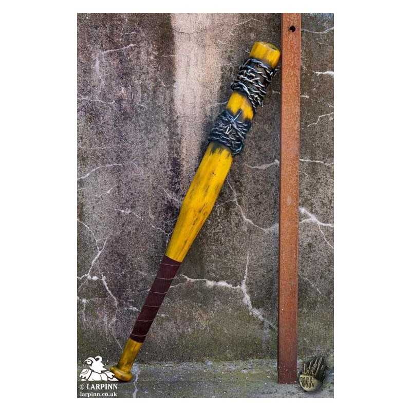 This 80 cm long Barbed Wire Bat has a 17 cm handle wrapped in soft split-leather, and also features the typical baseball bat knob at the end. The rest of the bat is hand painted yellow with faded colouring, with metallic strands of wire and flexible barbs around the end.