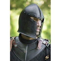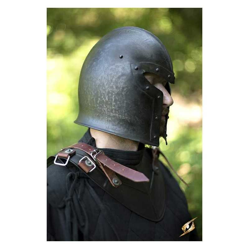 The Barbuta is a style of helmet inspired by Italian soldiers of the 15th century. Designed to protect the head during combat, the Barbuta is elegant as well as functional. The helmet covers the head, neck, and most of the face--while still offering clear vision through the helmet’s Y-shaped visor, which has been reinforced with additional rolled steel and rivets. Enjoy this sleek and easy to wear design, demanding attention on the battlefield with such details as the curved crest running from forehead to neck.
