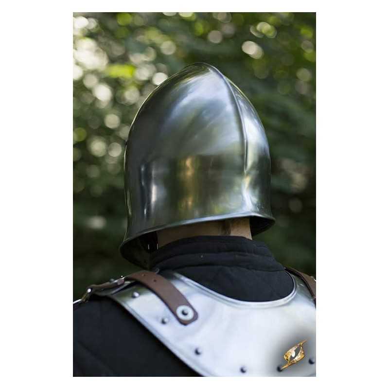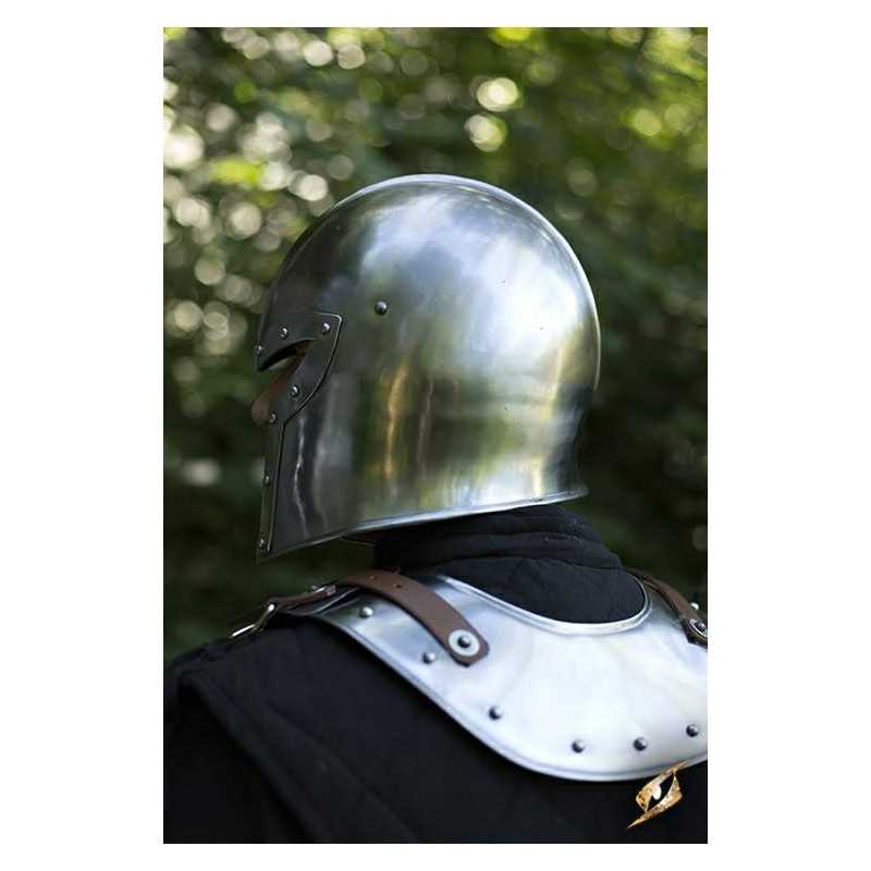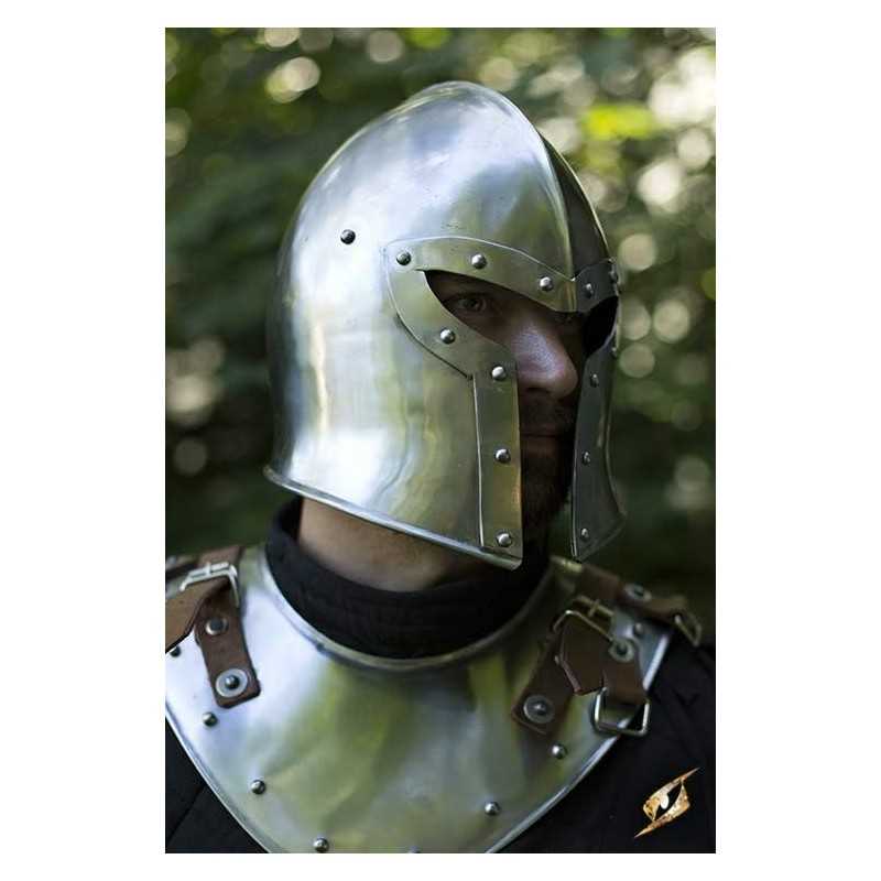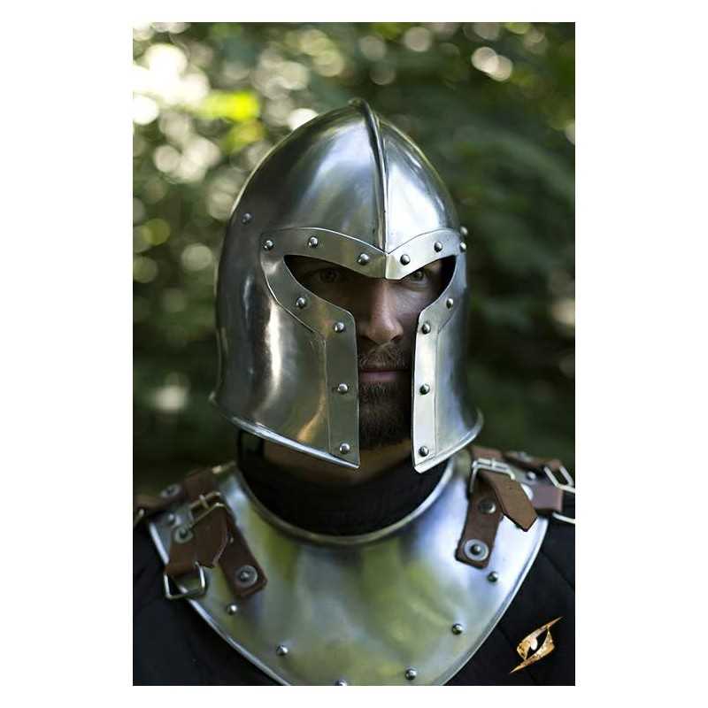 The Barbuta is a style of helmet inspired by Italian soldiers of the 15th century. Designed to protect the head during combat, the Barbuta is elegant as well as functional. The helmet covers the head, neck, and most of the face--while still offering clear vision through the helmet’s Y-shaped visor, which has been reinforced with additional rolled steel and rivets. Enjoy this sleek and easy to wear design, demanding attention on the battlefield with such details as the curved crest running from forehead to neck.