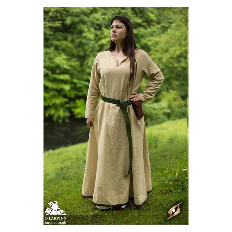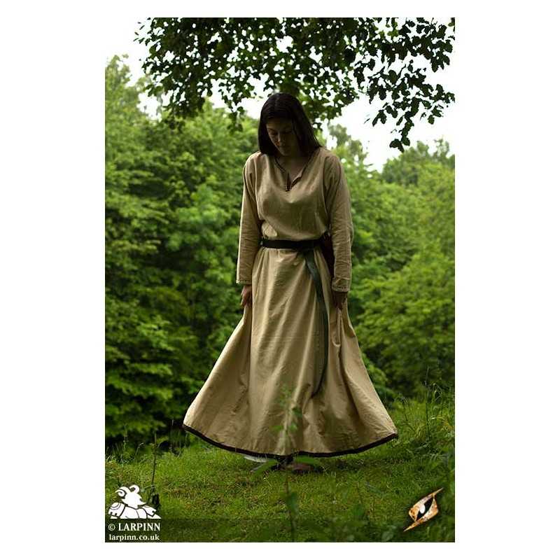 Epic Armoury's Basic Dress is a simple but graceful slip-on dress with long sleeves designed to function on its own or to be combined with other Epic Armoury clothes. The V-cut neckline and wrists are embroidered with a contrasting broad stitch, while the bottom hem is trimmed with matching edging. Made from comfortable, soft cotton, this dress reaches from the shoulders to the ankles and has a comfortably wide skirt to allow for easy movement.
