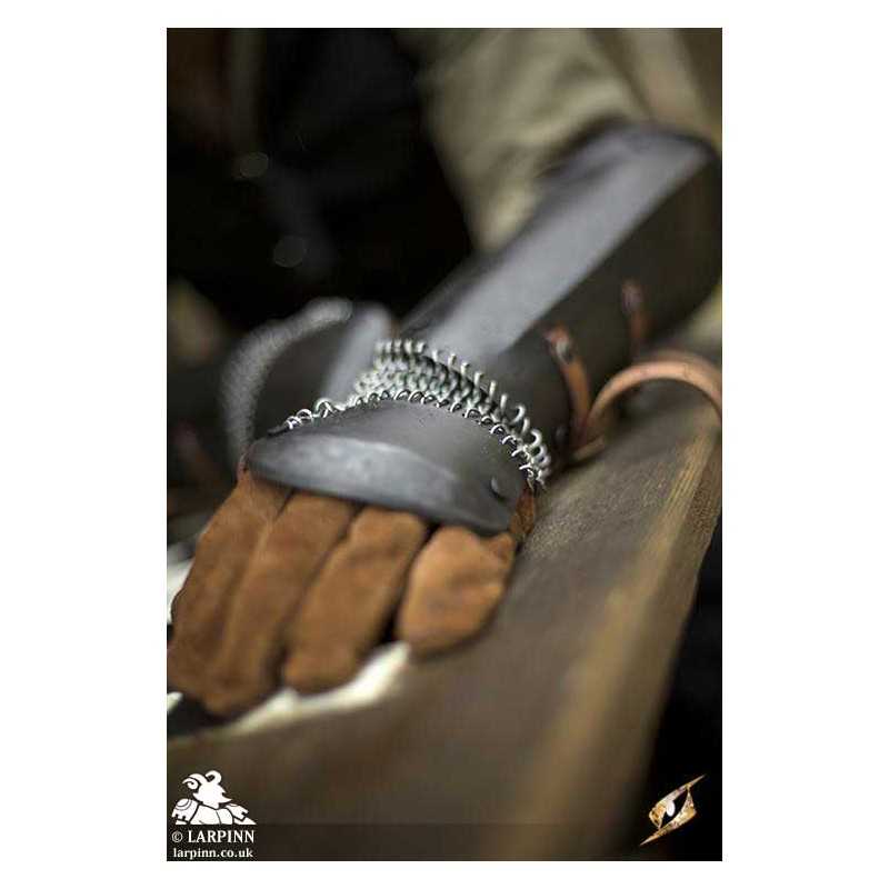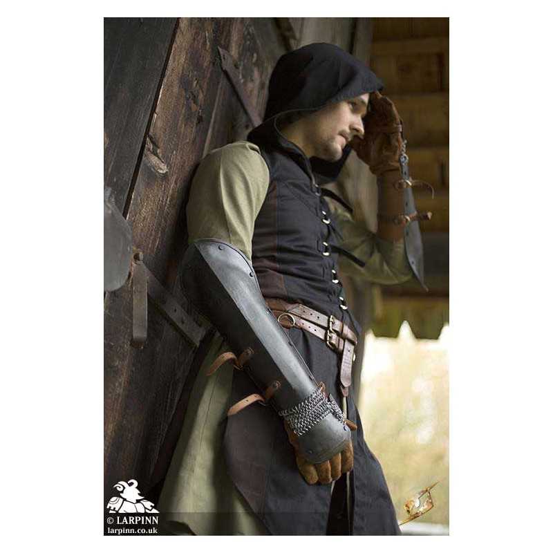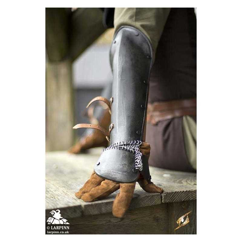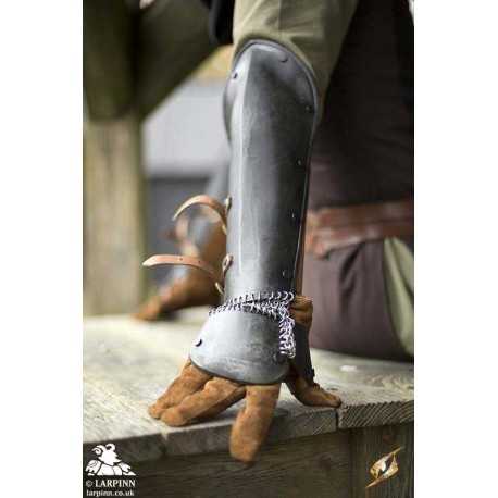 The Epic Dark Bazuband is an elegant piece of armour designed to protect your forearms. The Bazuband is a compromise between the discomfort of gauntlets and the mobility of demi-gauntlets, providing comfort and the freedom of movement you desire. Paired with your own leather glove, these robust steel plates efficiently protect the back of your hand, thumb, and underarm while strong chainmail connect the plates to ensure unbridled--but protected--movement.