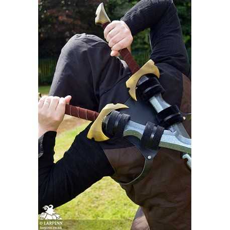 The Borr Double Back Scabbard is a hand made high-quality leather harness designed for two swords. The adjustable buckled chest straps hold the back scabbard securely in place as the two swords are fixed with their handles easily accessible above each shoulder. The double loops that holster your weapons are lined with velvet for a smooth draw and minimal wear and tear on the latex blades. The Borr Double Back Scabbard is an epic piece of equipment for any larp, theater or cosplay character.