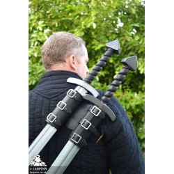 The Borr Double Back Scabbard is a hand made high-quality leather harness designed for two swords. The adjustable buckled chest straps hold the back scabbard securely in place as the two swords are fixed with their handles easily accessible above each shoulder. The double loops that holster your weapons are lined with velvet for a smooth draw and minimal wear and tear on the latex baldes. The Borr Double Back Scabbard is an epic piece of equipment for any larp, theater or cosplay character.
