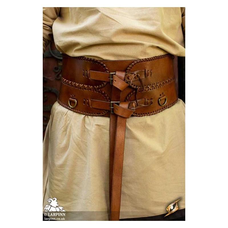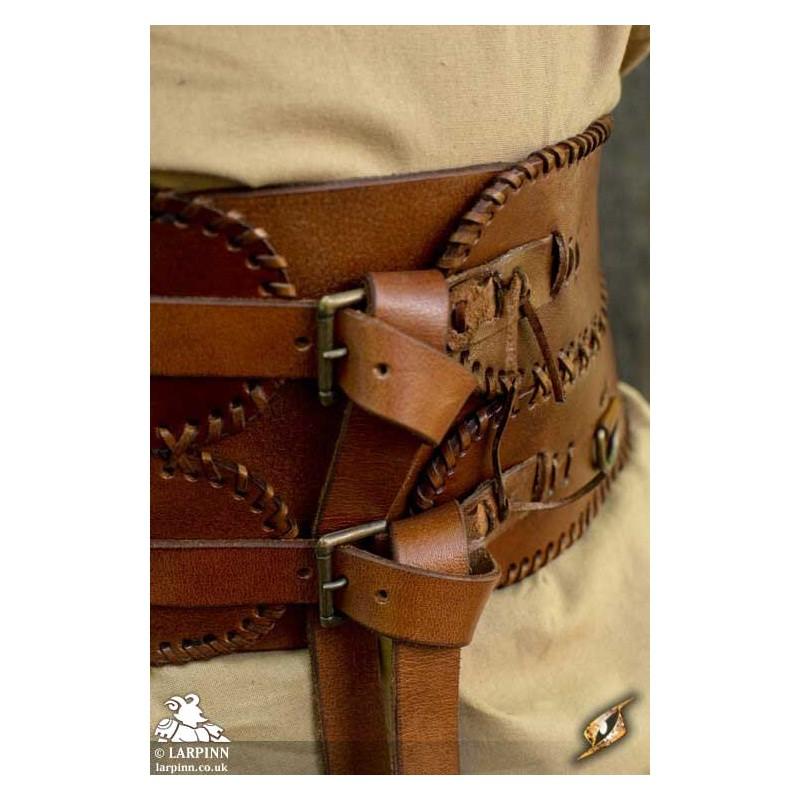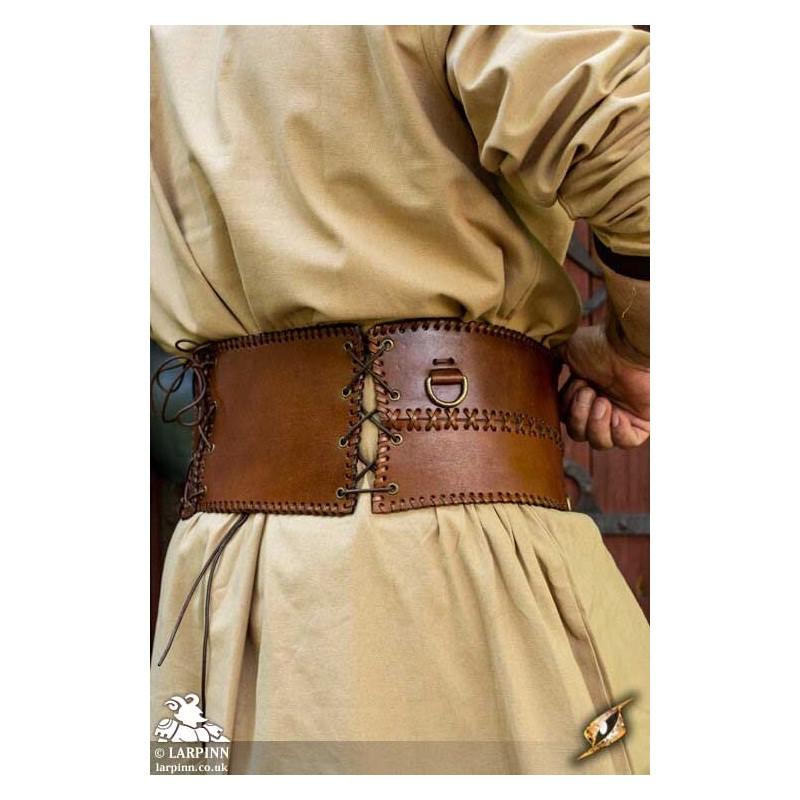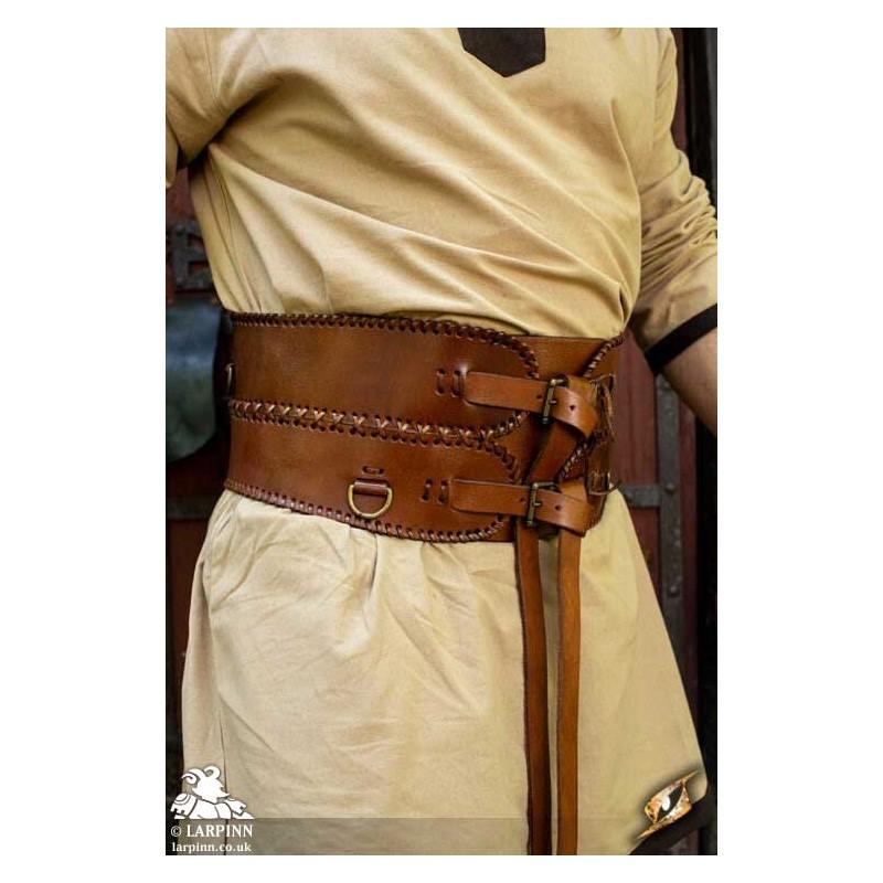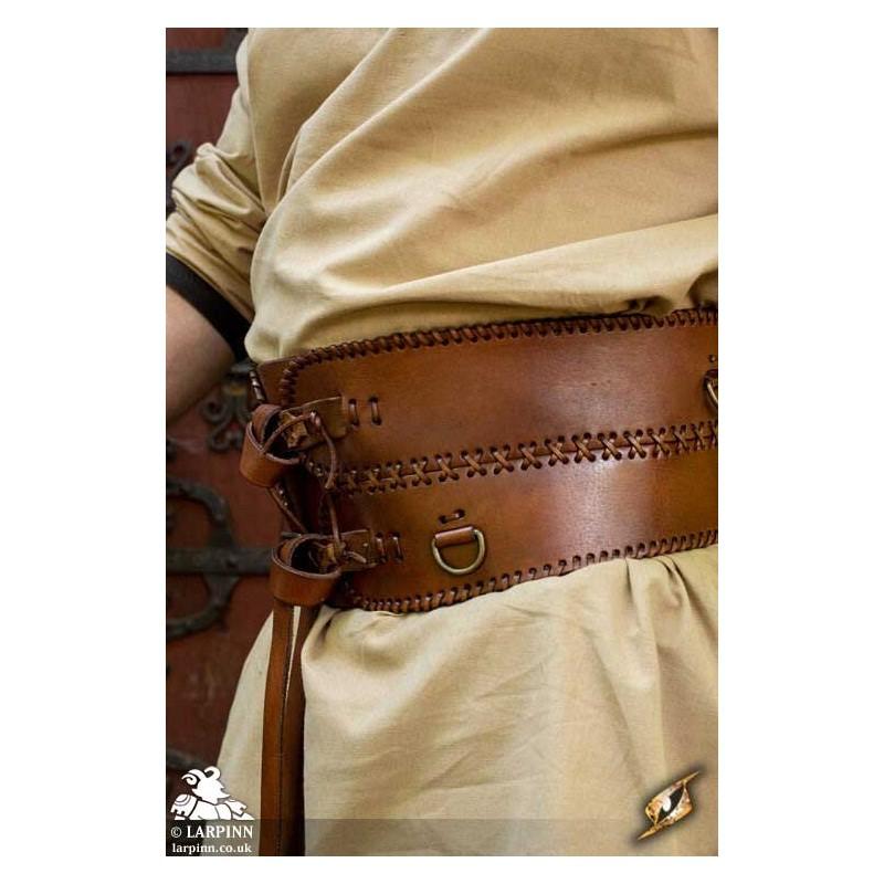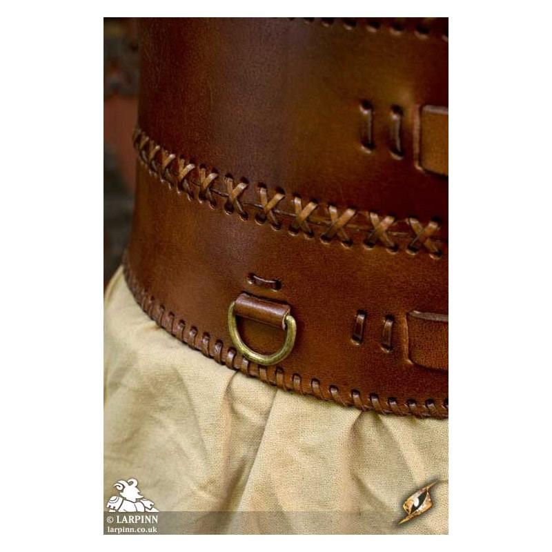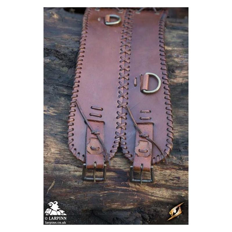 This bestselling Epic Armoury Broad Belt is a hefty leather belt fitted with D-rings for attaching additional equipment. The belt is made from two connected parallel leather pieces and adjustable braces at the front and back. The belt’s rim is stitched with a leather cord, adding rural detailing that gives life to your costume. Fasten the belt by securing its two 70 cm long belt tongues over a heavy leather plate on the front, locked in place by two rounded, brass belt buckles. Two spacers are included with each belt to give an extra option for customization and perfect fit. The spacers can be used alone or in combination.