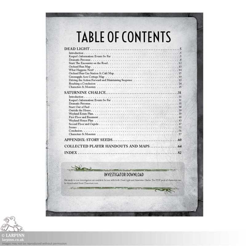 In addition, the book includes a new scenario, Saturnine Chalice, by Matthew Sanderson, which also takes place during a roadside stop that leads to danger and mystery. Carrying on the roadside theme of both Dead Light and Saturnine Chalice are six new adventure seeds, each with ideas for encounters on the road that Keepers can use as inspiration for short sidetracks, one night games, or to develop into full-blown scenarios.