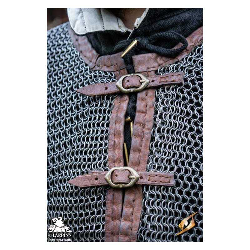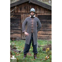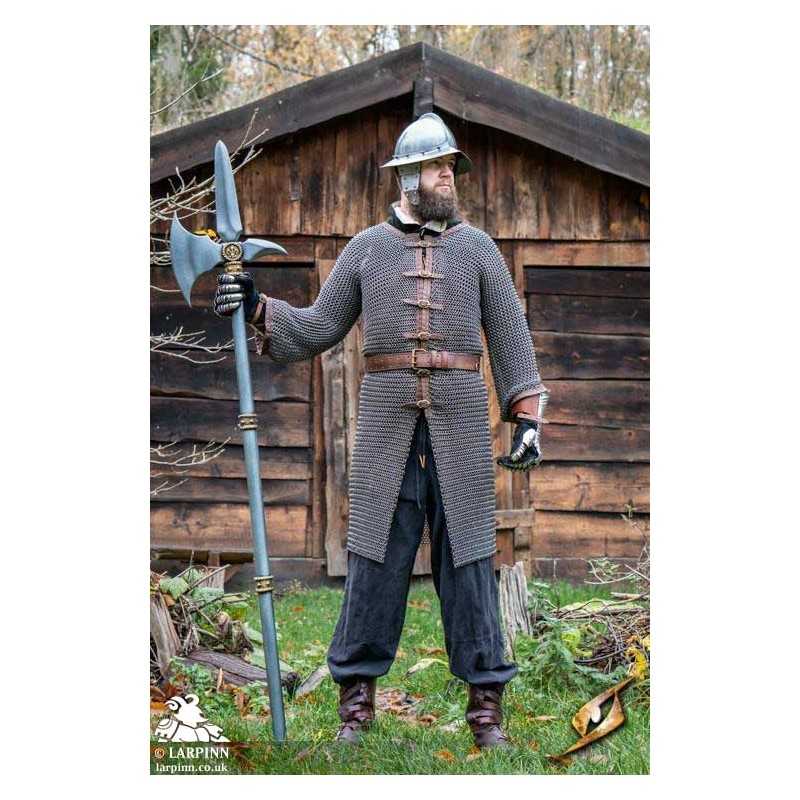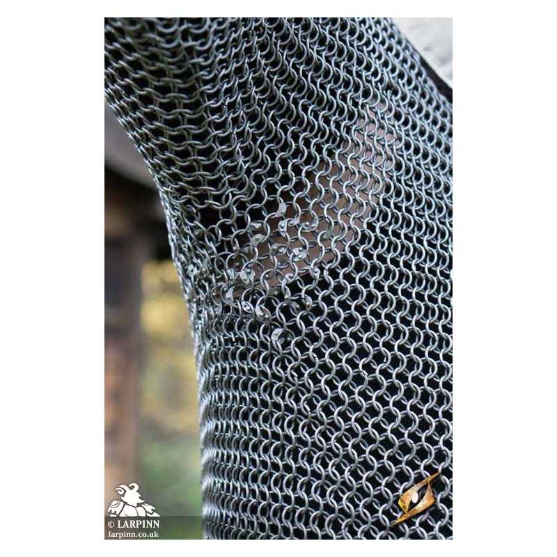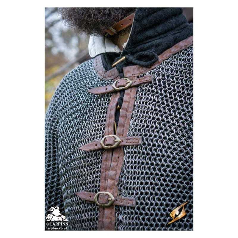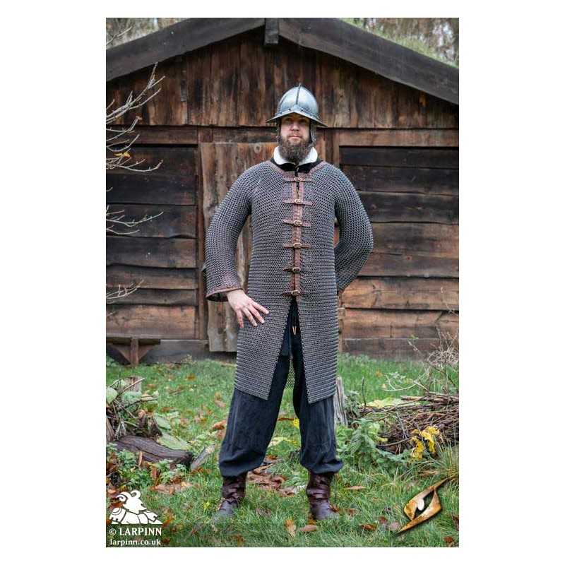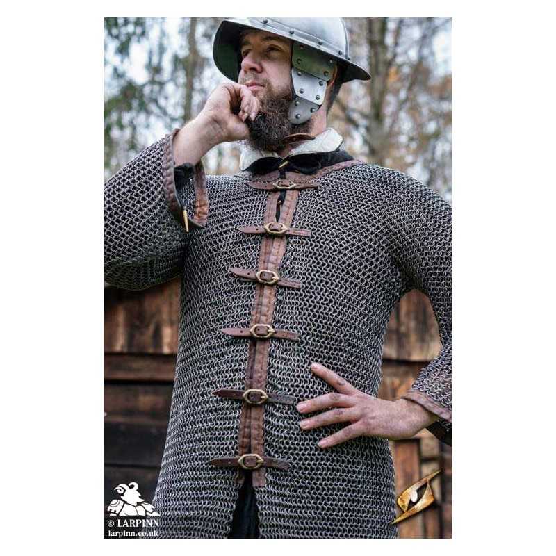 The Epic Armoury Captain Chainmail is effortless to put on and is comfortable to wear in Larp battle. This flexible mail tunic has hand-stiched leather edging with a series of buckles in the front for a quick fit. The mail covers the body from the shoulder to the thighs and has long sleeves. Each butted ring interlocks with four other rings in a 4-in-1 design. The armpits are reinforced with riveted rings designed to cope with the weight when lifting your arms during combat. This chainmail can easily be worn over a gambeson for more comfort and to prevent bruising in battle.