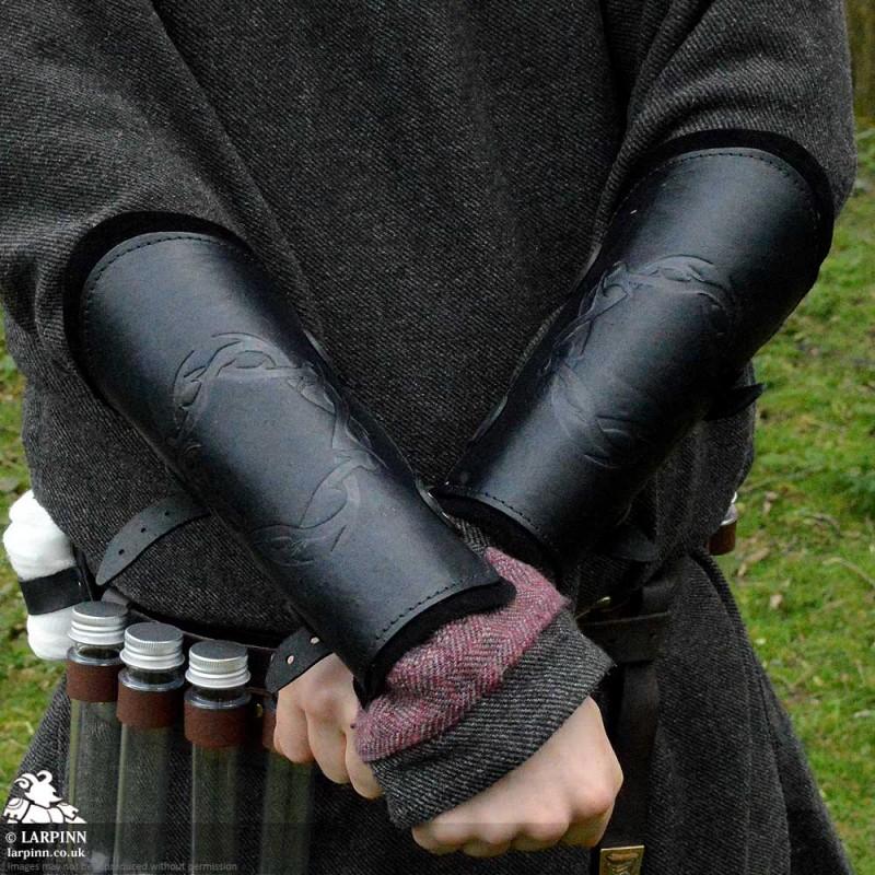 These bracers are made from two layers. The top layer is high-quality veg tan leather, embossed with the design and hand-dyed. The back plate is made from soft suede to add comfort. The supple leather molds to the wearer's arms over time, ensuring a personalized fit for maximum mobility.