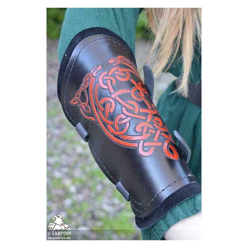 These bracers are made from two layers. The top layer is high-quality veg tan leather, embossed with the design and hand-dyed. The back plate is made from soft suede to add comfort. The supple leather molds to the wearer's arms over time, ensuring a personalized fit for maximum mobility.