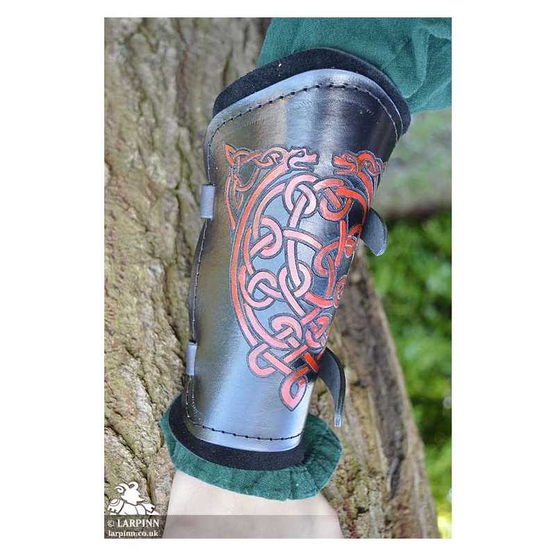 These hand painted bracers are made at Larp Inn, in the UK. These bracers are etched and hand dyed by us, providing beautiful quality and a unique finish on every pair. The thicker leather used on the top layer makes them perfect for 'Medium Armour Use' at most LARP Systems. However, the bracers work perfectly on their own. The calf suede finish on the inside is used for maximum comfort.