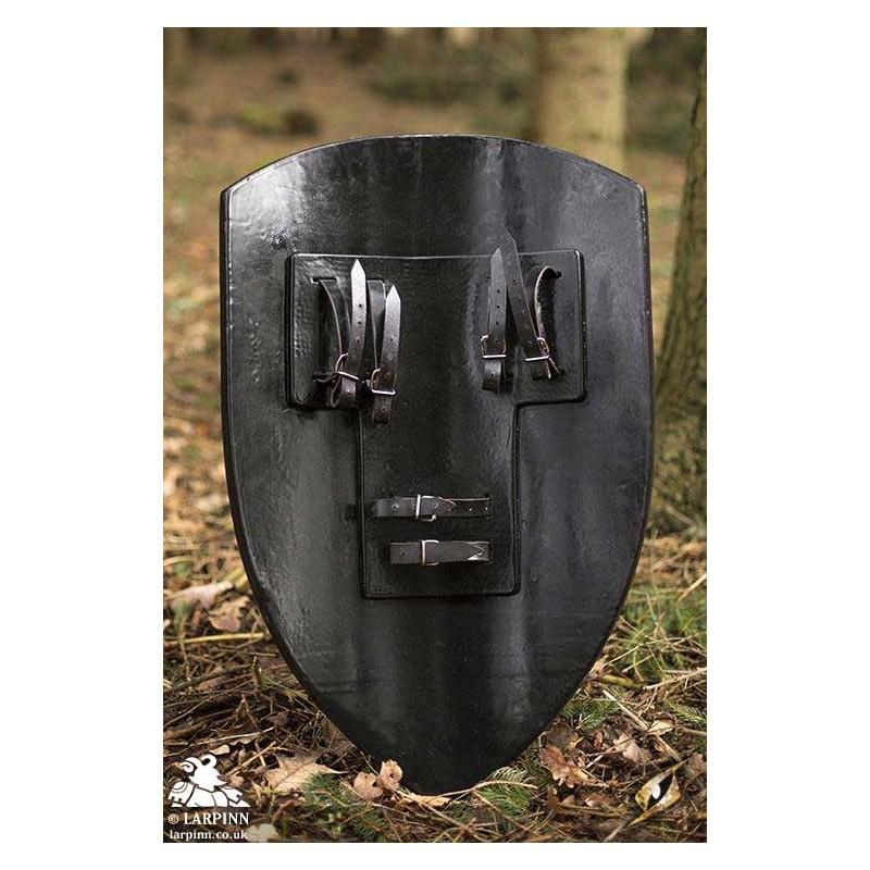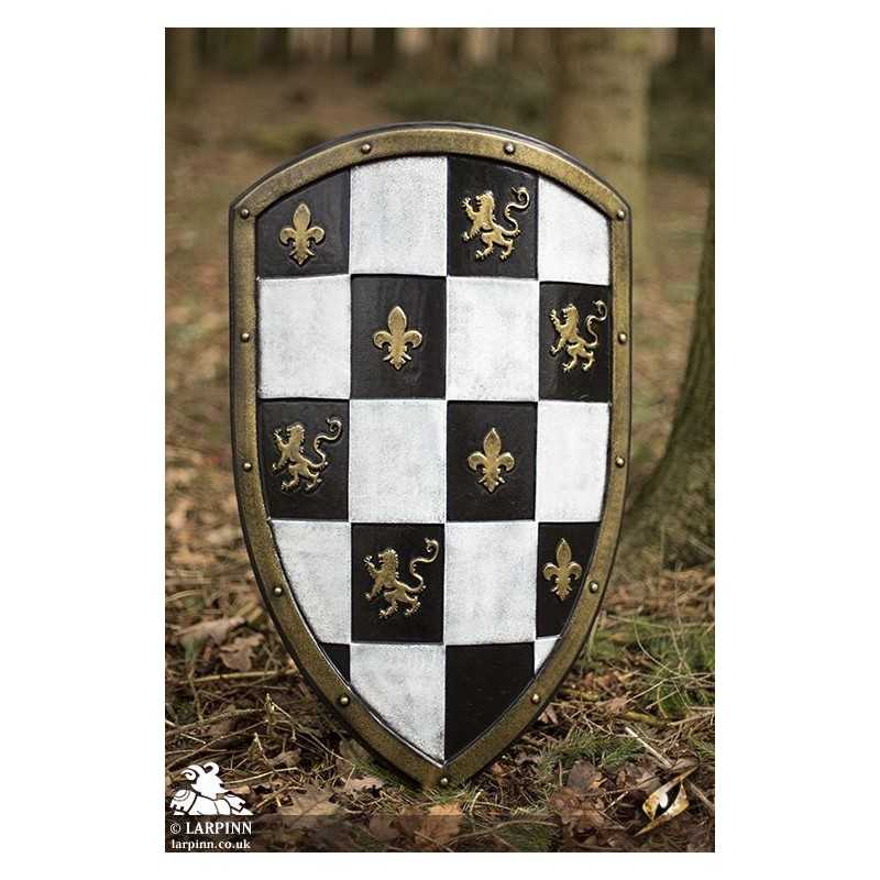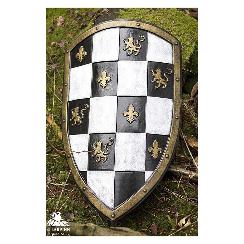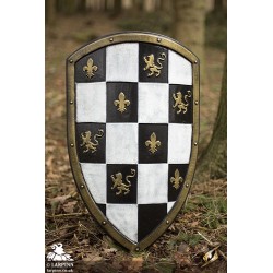 Epic Armoury’s Checkered Shield is a semi-curved, kite-shield inspired by 10th to 12th century Normans. Finished with a beautifully detailed laser-cut heraldry pattern, this shield will fit perfectly in the hands of an infantryman or knight. The rest of the shield is handmade and painted, designed to look like a lacquered shield with a metal rim.