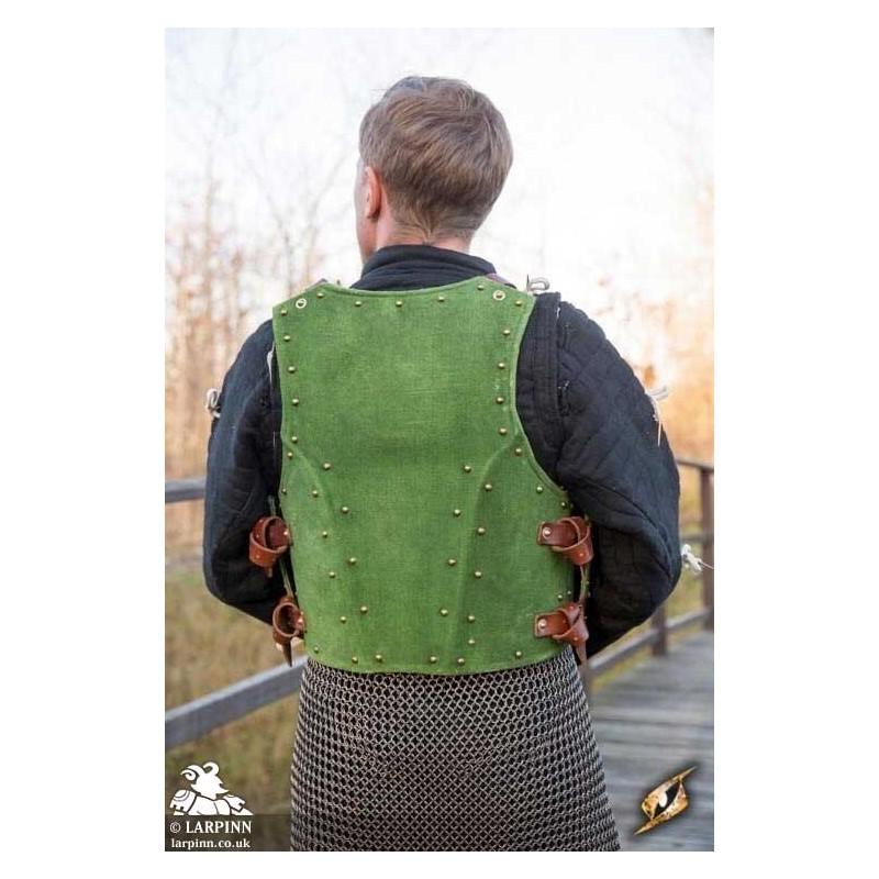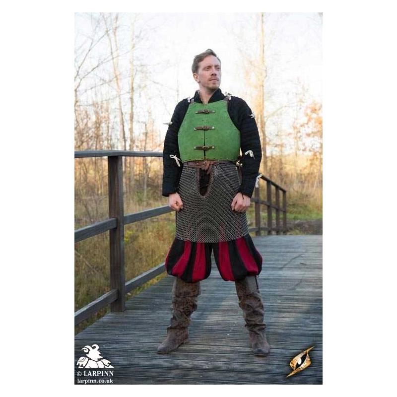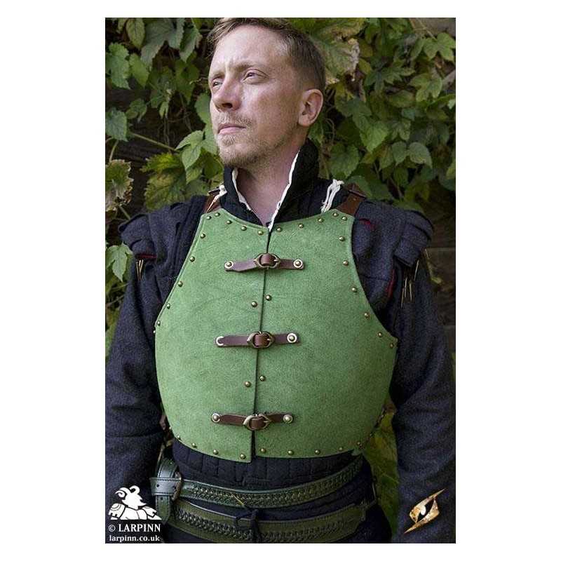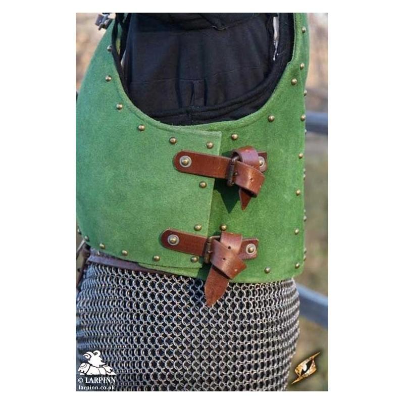 Epic Armoury’s Green Corrazina is a beautiful low-fantasy piece of armour protecting the front and back of the torso and abdomen. The plate rests at the waist and is sculpted to fit the body and add structural strength to the steel. This steel riveted piece has been covered with a luxurious and soft layer of red suede leather, giving it a particularly rich appearance.