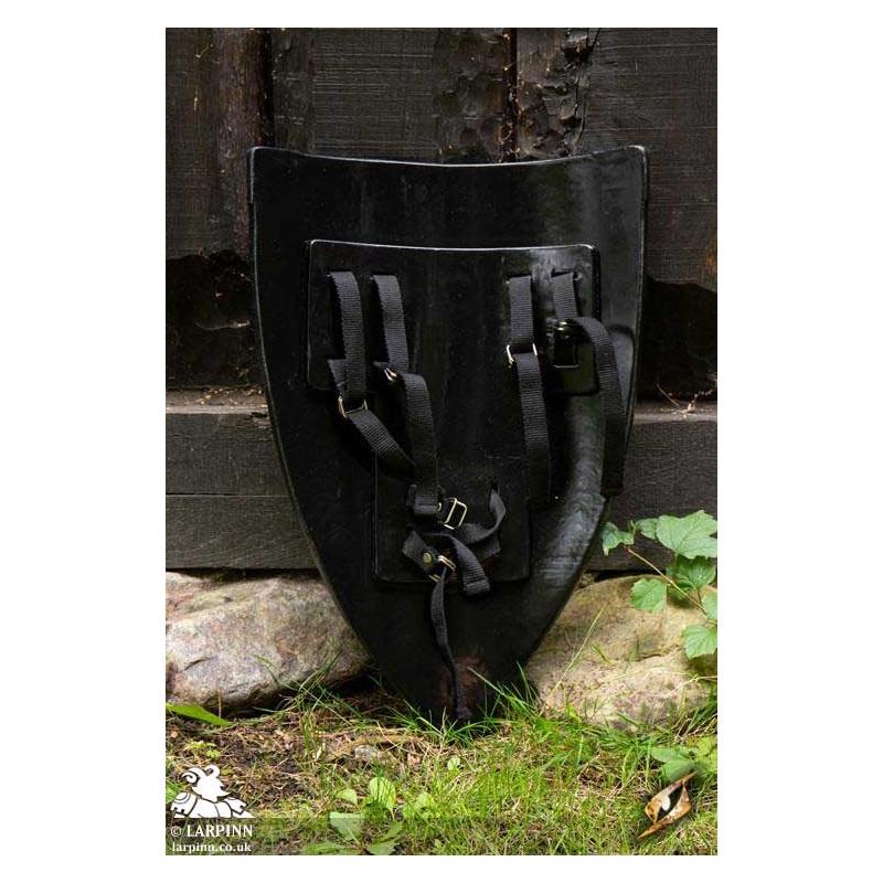 Wear the Crusader Shield left- or right-handed with the use of its versatile three leather arm straps on the back, secured through hard EVA foam for a reliable and solid grip made to last. Feel confident that this latex shield will withstand the continued abuse of a LARP with regular latex maintenance.