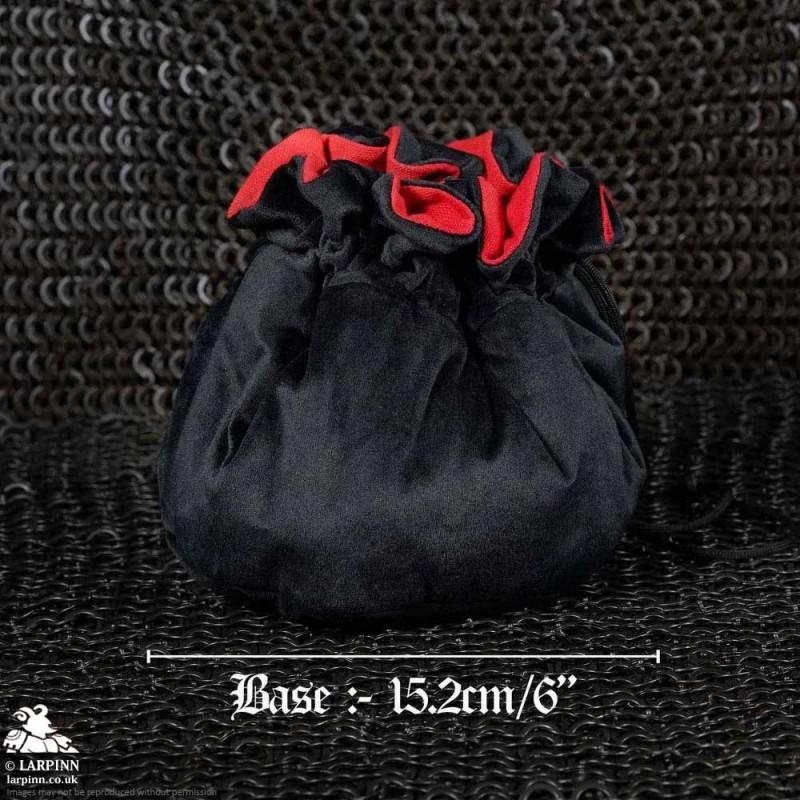 The bag is carefully tailored with firmly sewn red canvas cotton on the inside, making up seven pouches to hold all your dice. The black velvet exterior makes it supple to touch giving it an eye-catching texture.