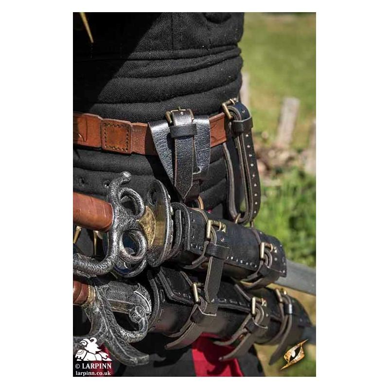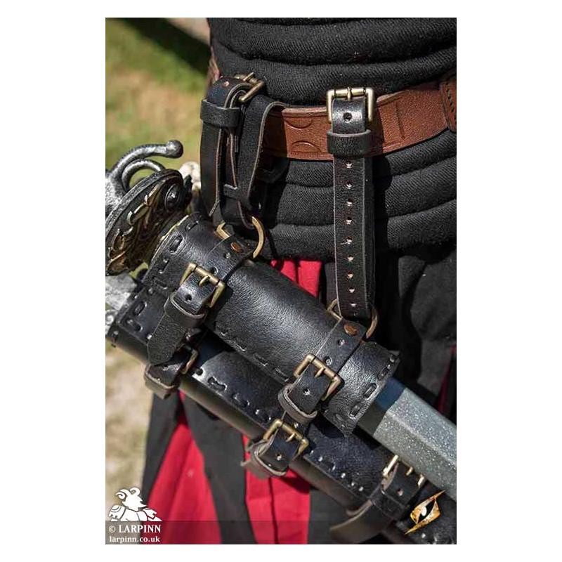 The Double Holder/Scabbard is made with 2 adjustable buckles on each section; this allows you to adjust the size of each holder to suit whatever weapon size you want to use. Use it for two swords, or a sword and an axe.