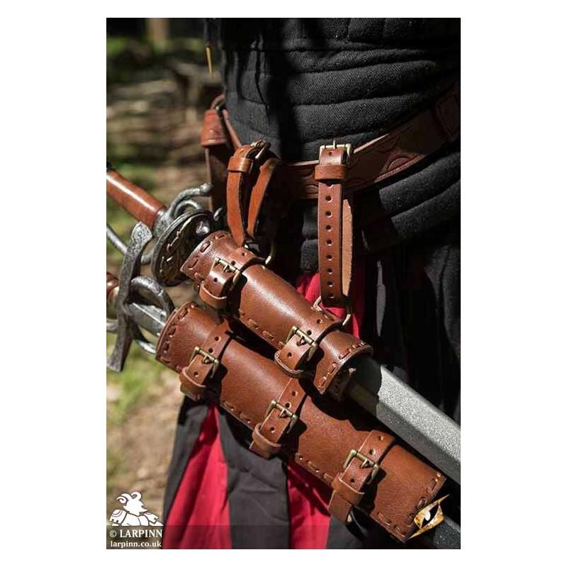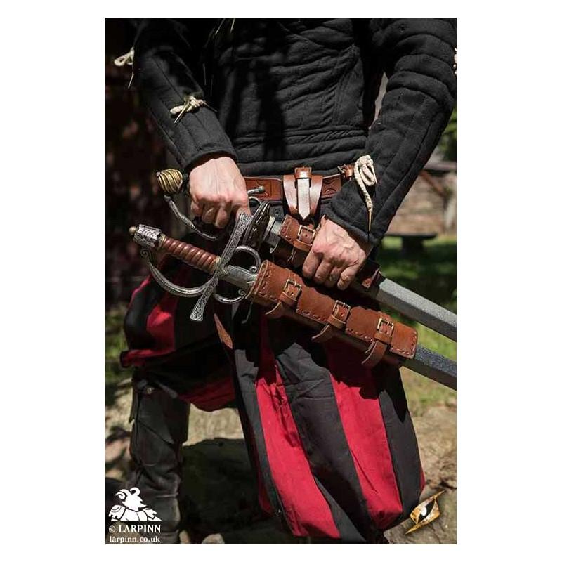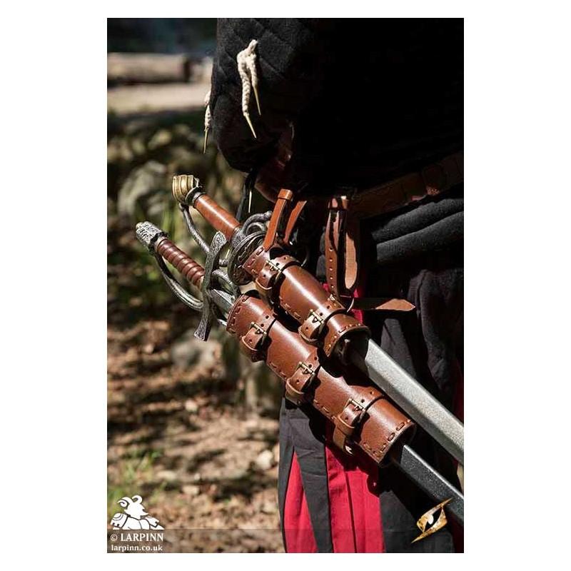 The Double Holder/Scabbard is made with 2 adjustable buckles on each section; this allows you to adjust the size of each holder to suit whatever weapon size you want to use. Use it for two swords, or a sword and an axe.