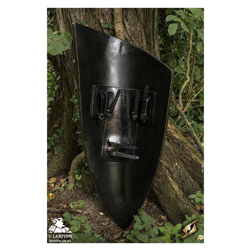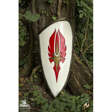 Epic Armoury’s White Elf Shield is a large 120 cm long shield inspired by historical kite and tower shields, but given an elven flair. A hand painted white field on the shield provides great contrast to the black and green winged heraldry. The rim is detailed to look like smooth black wood, curved and elegant to match the elves’ natural grace.