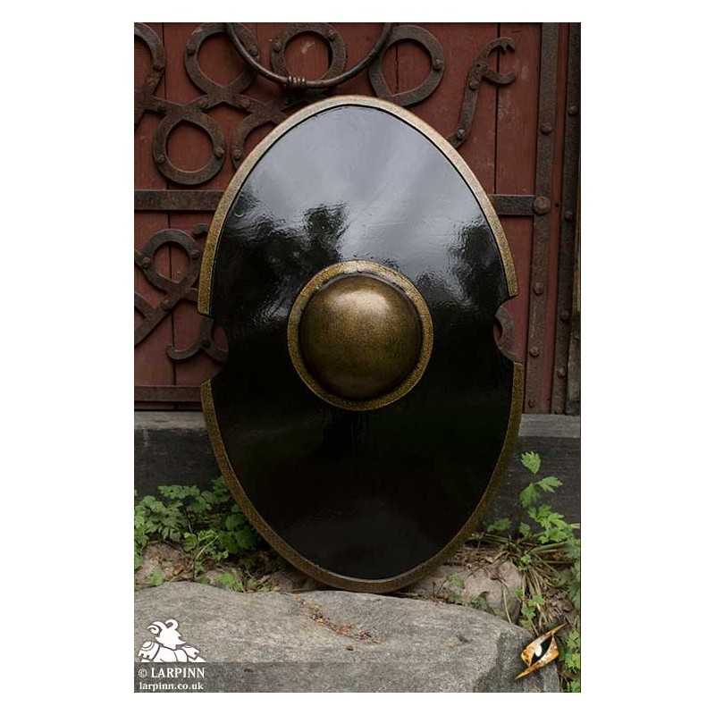 Epic Armoury’s Elliptical Shield is an oval latex shield inspired by Ancient Roman soldiers. Finished with a black body and tarnished brass rim and shield boss, this shield is sure to impress your fellow warriors on the battlefield.