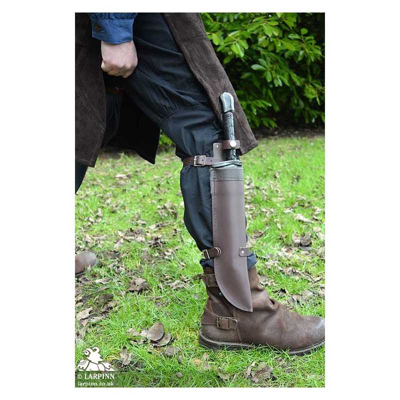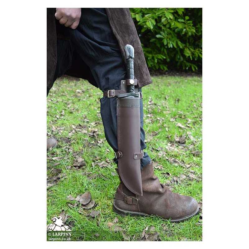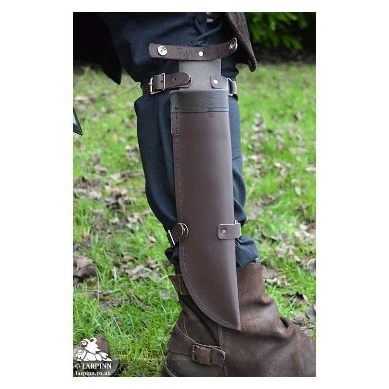 The Elred Dagger Leg Scabbard is a handmade leather dagger holder which straps to your leg, keeping your dagger safe and secure. Designed for use with Larp, Cosplay or theater costumes, the soft trim helps to protect latex props and the adjustable straps means you can adjust the tightness of the straps around your leg.