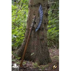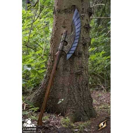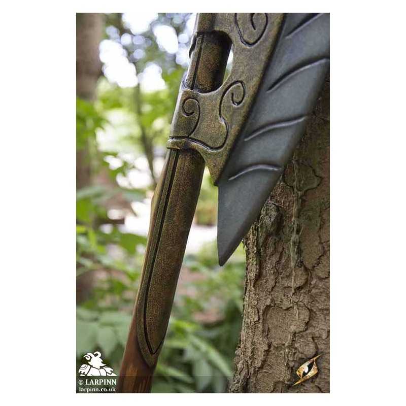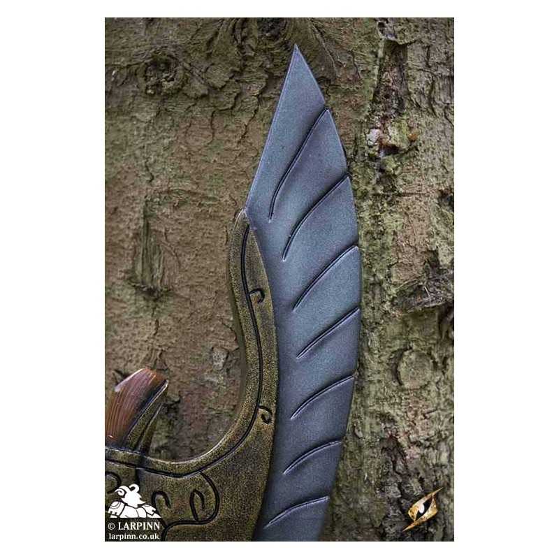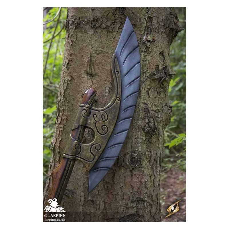 Epic Armoury’s Elven Wing Axe is the proper weapon for elven warriors. With an elegant crescent-shaped head curving back towards the wood-textured haft, this axe is made to be effective in semi-ranged combat. The head has a long curved 70cm edge and is made to look like the feathers of a bird, and its 16 cm width is secured to the haft by a decorative gold plate. The total length of the weapon is 150 cm, sculpted and painted with great realism.