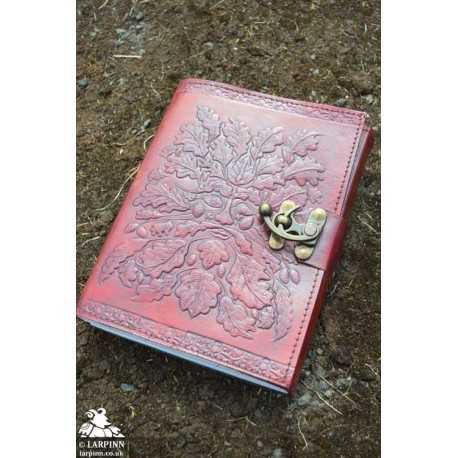 The outside of the book is covered in reinforced mahogany leather that has been embossed with a beautiful greenman design and and can be sealed with bronze coloured clasp. Bound inside is over one-hundred blank pages all made from a rustic looking cream pulp.