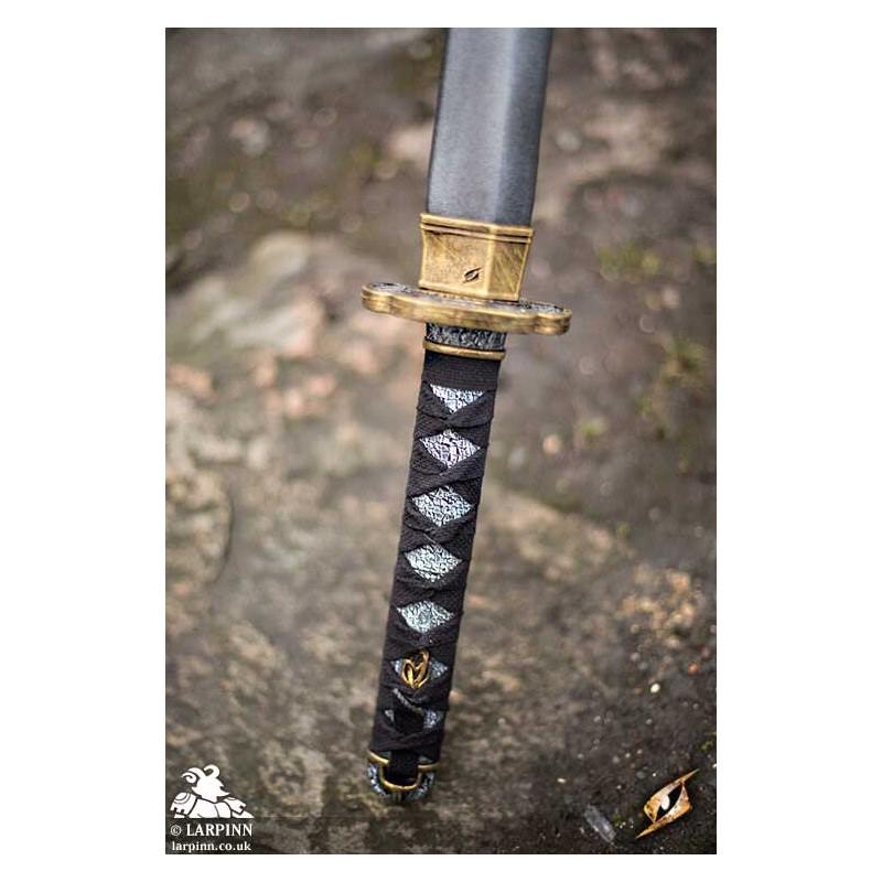 Epic Armoury’s Dai Katana is a latex-hybrid sword featuring a distinctive Asian appearance with a squared guard. The sword is 140 cm long from tip to pommel, with a 105 cm slender, single-edged blade. The long detailed handle accommodates two hands and a firm, comfortable grip while on the battlefield. The handle is 24 cm long, cast and painted to look like fabric bound in a diamond patterned menuki-style.