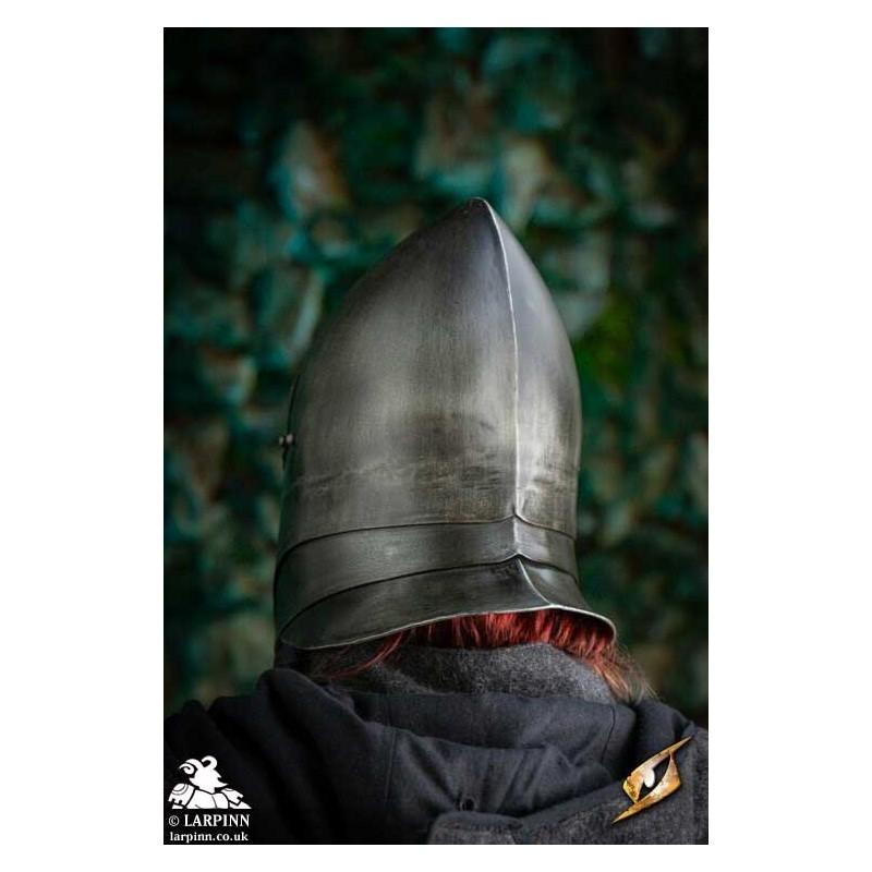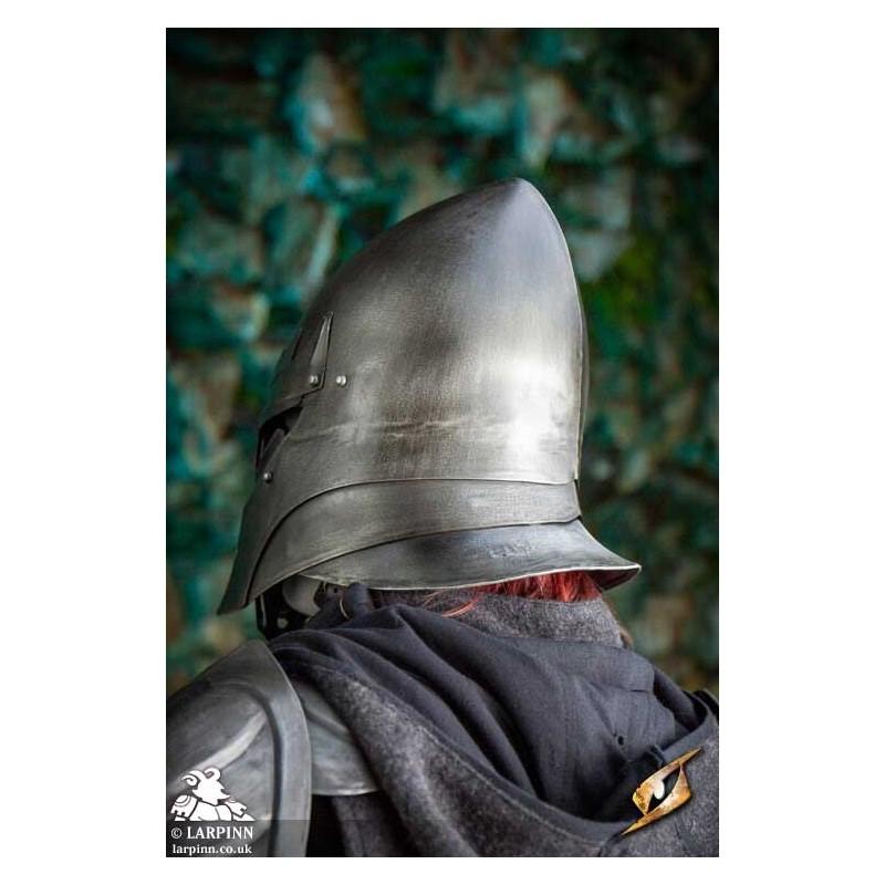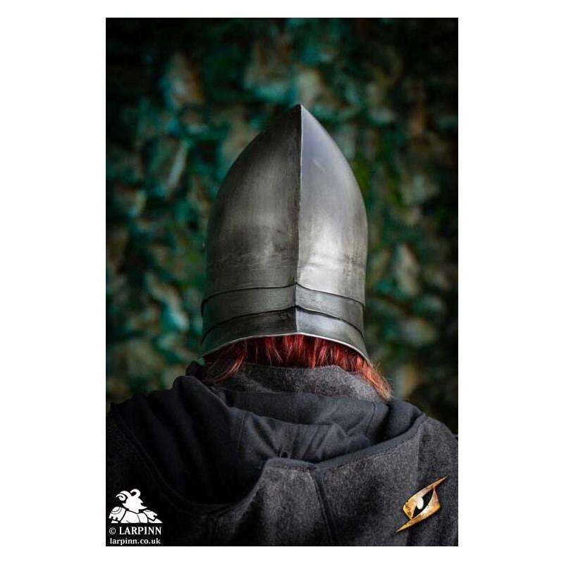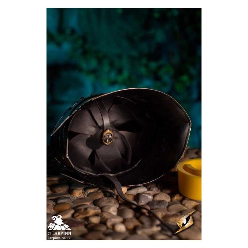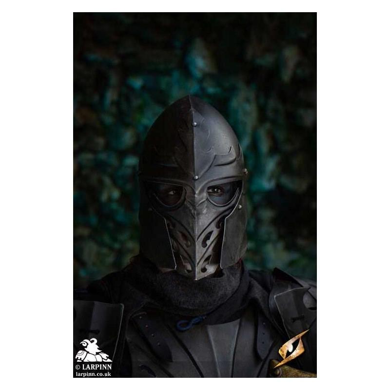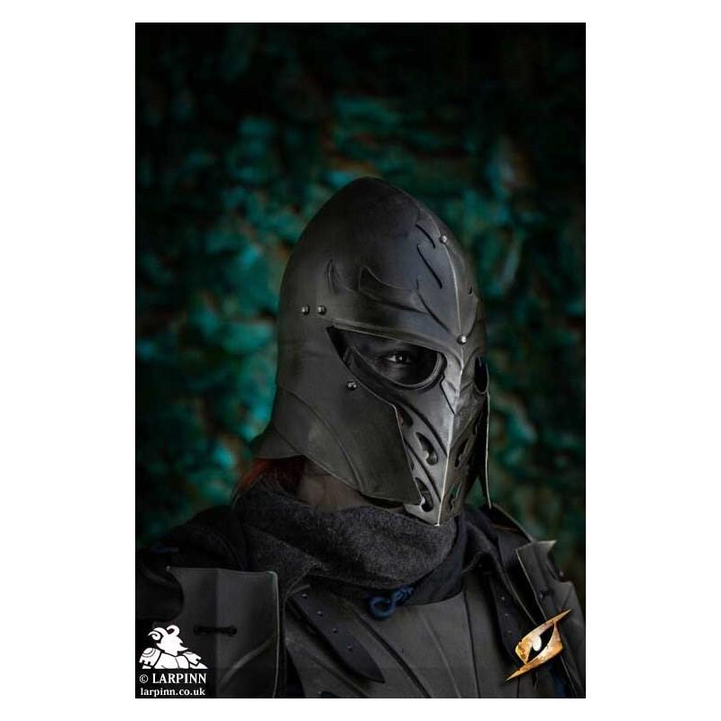The modern dark elves and the classic Svartálfar of Norse mythology inspire Epic Armoury's Eventide Helmet. The large eye slits allow for greater peripheral vision than most helmets, and the slats cut into the mouthguard mean the airflow is only minimally disrupted. The helmet combines sturdy leather and steel for protection, with the leather as the steel's backing. This ensures greater comfort than the naked steel. The helmet's fit can be adjusted with the padding that comes with it, and leather straps allow you to tighten it around your chin.
