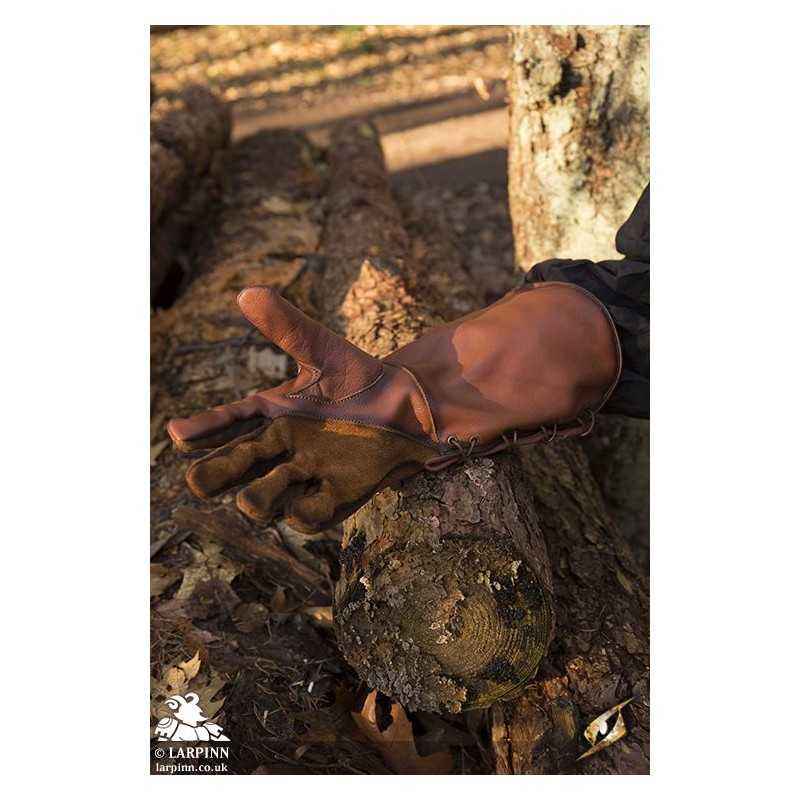 The Falcon Leather Gloves are leather gloves with long cuffs to protect the forearm. They are made from brown dyed leather with two suede fingers. All joints around the fingers, wrists and edges are stitched, improving the strength of the material by preventing it from deforming with heavy use or from exposure to the environment. The fit of the gloves can be adjusted with leather lacing along the side of the cuff.