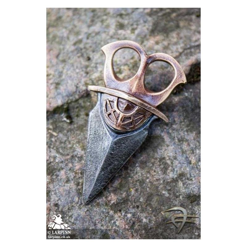The Fiskars Dagger is a small throwing knife, designed by Atelier Fantastic’Art to fit Epic Armoury’s Universes. This 13 cm knife is an elegant and well-balanced weapon with a straight 8,5 cm double-edged blade. The 4,5 cm handle, sculpted and carved with a small Celtic-inspired pattern and a cross guard, attaches to the blade, which is hand painted to look like cold metal. Two finger holes at the bottom of the handle makes this cute dagger resemble a pair of scissors and allow you to “wear” the dagger as such