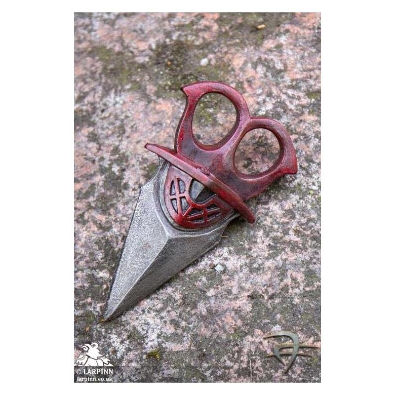 The Fiskars Dagger is a small throwing knife, designed by Atelier Fantastic’Art to fit Epic Armoury’s Universes. This 13 cm knife is an elegant and well-balanced weapon with a straight 8,5 cm double-edged blade. The 4,5 cm handle, sculpted and carved with a small Celtic-inspired pattern and a cross guard, attaches to the blade, which is hand painted to look like cold metal. Two finger holes at the bottom of the handle makes this cute dagger resemble a pair of scissors and allow you to “wear” the dagger as such