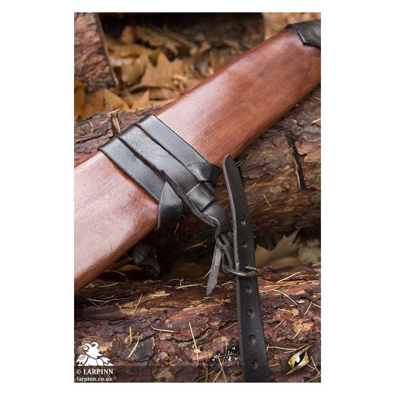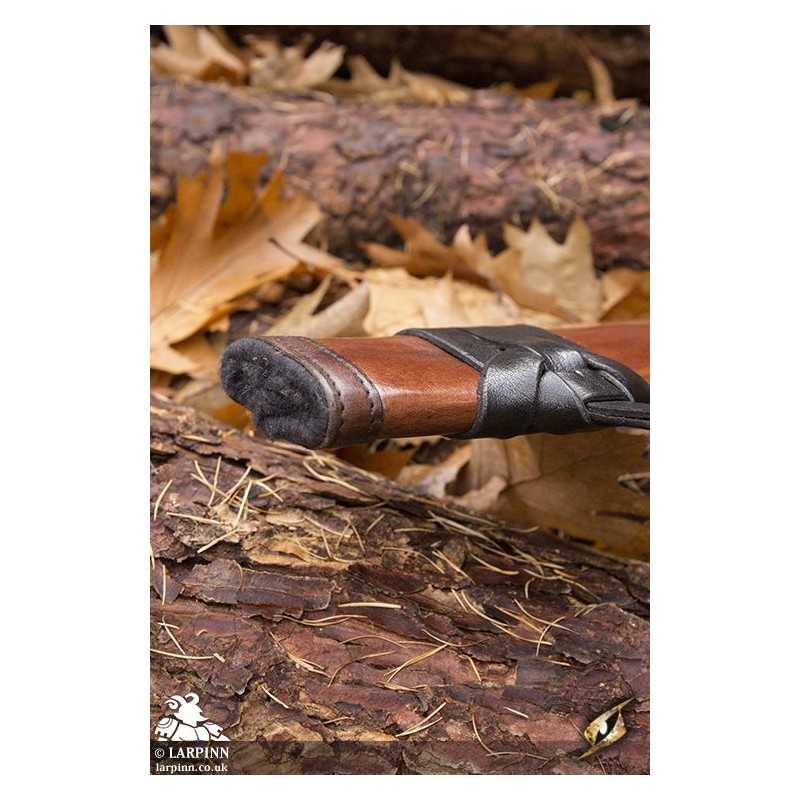 Match this Full Scabbard with any character you wish to equip by securing the holder to your belt through the belt straps. One strap is longer than the other, so the scabbard will sit on the belt at a comfortable angle. Made from vegetable-tanned full-grain leather and a hardened leather tip to prevent damage to your weapon, this weapon holder is built to keep its shape and withstand the abuse of a LARP with regular leather care.