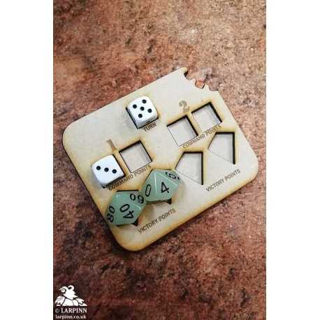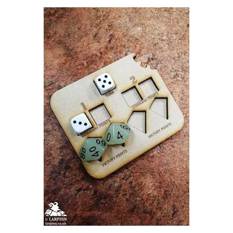 This pack contains a single 'Game Inn - Two-Player Turn Tracker'. Each marker is cut and etched from MDF. These markers have 'Turn' and 'Command Points' recesses designed for 12mm D6 and 'Victory Points' recesses for standard D10.