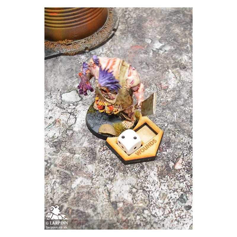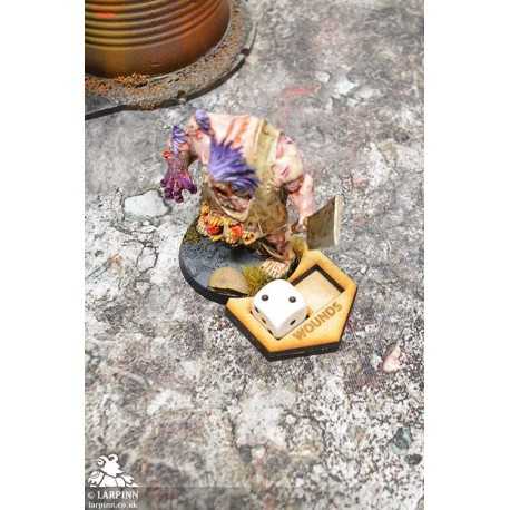 This pack contains three 'Game Inn - Wound Counters'. Each counter is cut and etched from MDF. These markers have a round recess designed to fit against a 40mm base, making them perfectly compatible with 25mm and 32mm. However, the arrow shape and design ensures they are easy to use with larger bases aswell. The counter recess is suitable for 12mm dice.