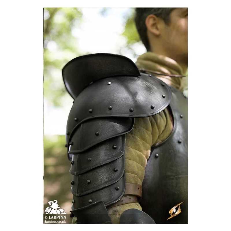 The Shoulder Plate Giant Dark Warrior are a set of two shoulder guards designed to protect the shoulder-joints and upper arm. This armour’s metal plates overlap one another to provide complete laminate protection. Overlaying the spaulders is a large pauldron, which provides additional protection to joints and armpits. Atop the pauldron a vertical plate sword breaker catches and deflects blows before they can impact the head. The sword breaker is slightly concave and somewhat higher at the back than the front, thus providing protection without impairing vision. Although the armour is designed to match Epic Armoury’s ‘Dark Warrior’ set, it is fully interchangeable with other Epic Armoury armours in order to fully customize your character’s look.