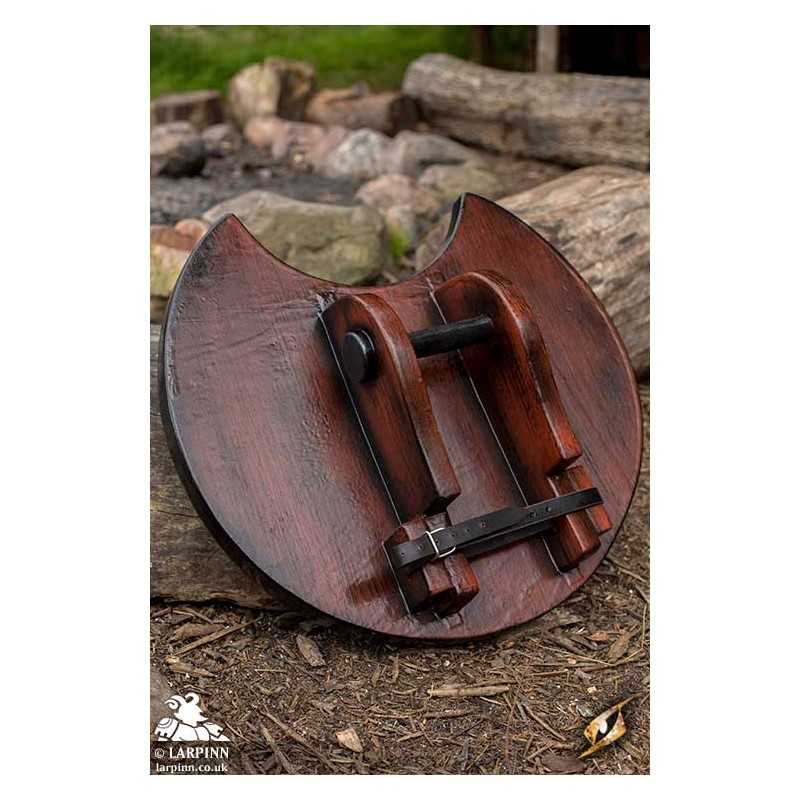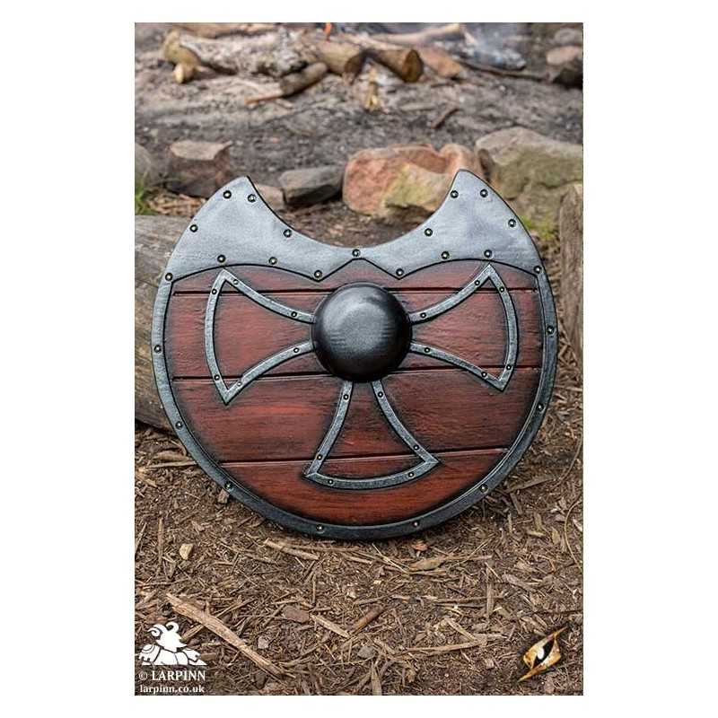 Epic Armoury’s Gobbo Shield is a light, flat latex shield with wood and steel details. The shield is shaped like a waning crescent moon, featuring a hand painted steel rim, shield boss, and Maltese cross. Detailed brass studs secure the metal to a wood base, textured and painted to look like realistic woodgrain.