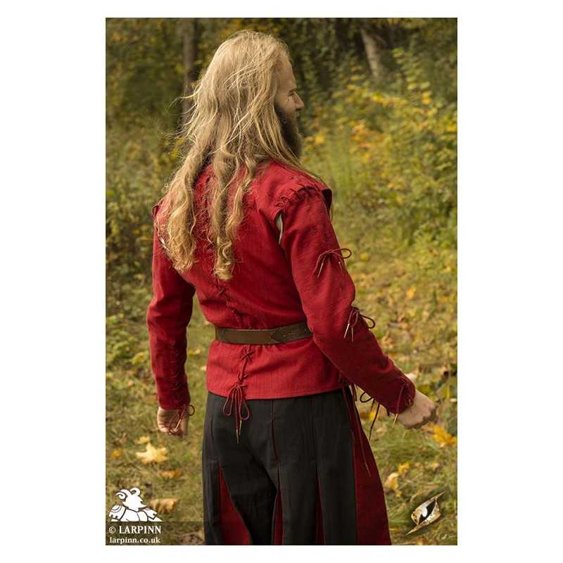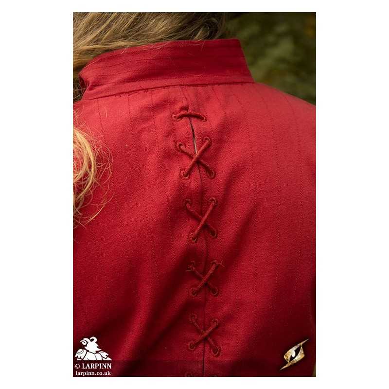 Epic Armoury’s Dark Red Pourpoint is a form-fitting long-sleeve coat covering the torso from the neck to the hips. It can be worn on its own or serve as padding under mail or armour. The pourpoint is donned like a jacket and secured along the front, sides and back with cotton cords, allowing you to customize the tightness of the fit. The arms are easily detachable by untying its cotton cords on the shoulders, each cord secured through long-lasting brass eyelets. Worn like a proper knight, you may attach hose and a leg harness to the four eyelets on the bottom front hem.