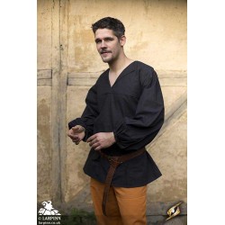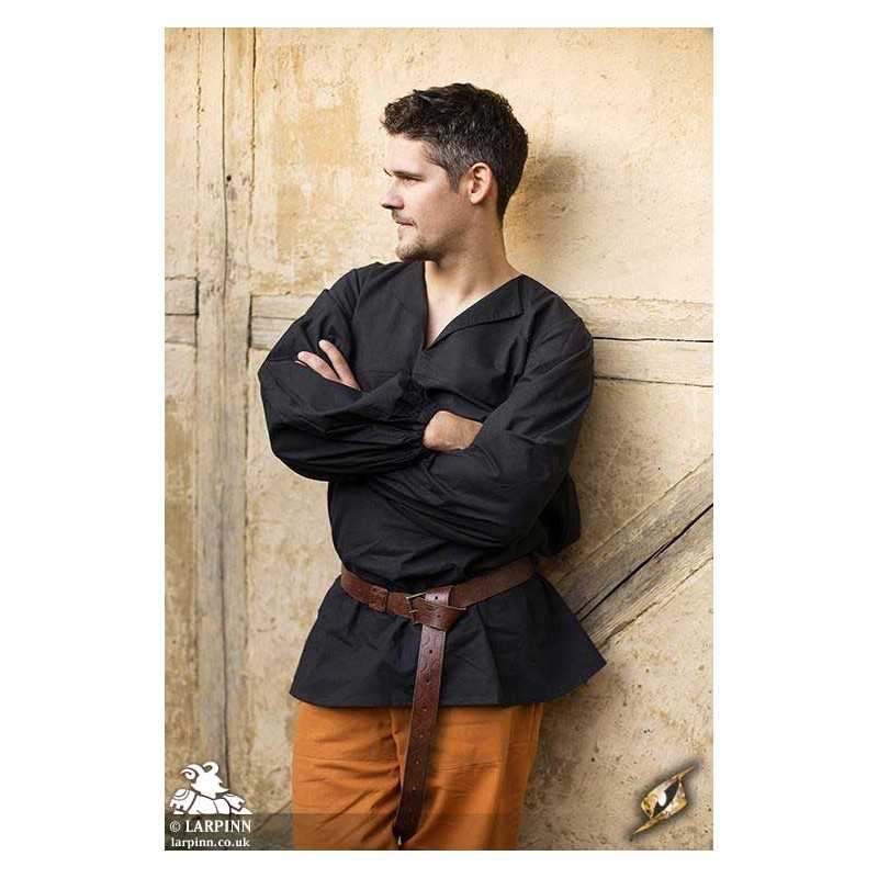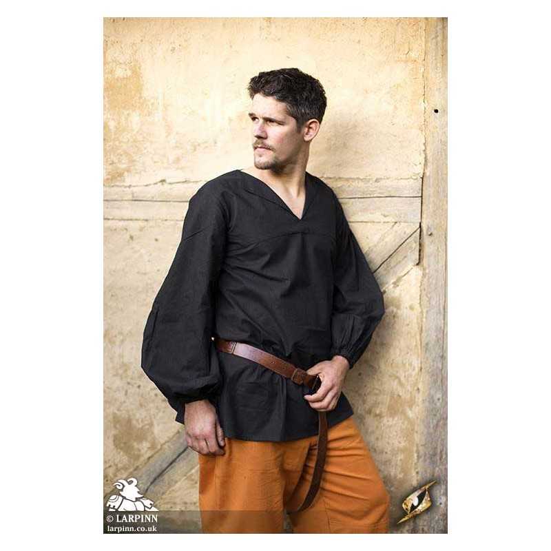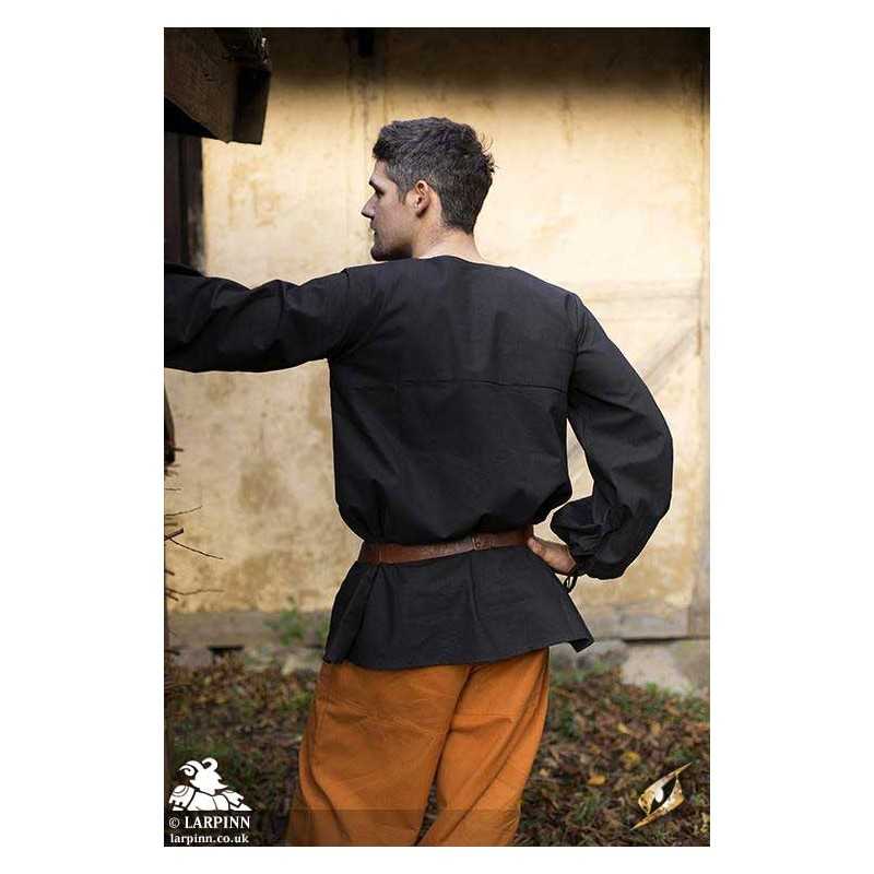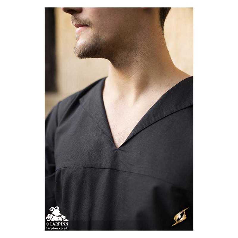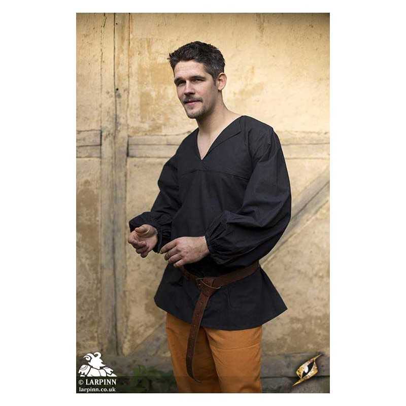 The Godfrey Shirt is a loose roguish garment made from light cotton and designed for both comfort and style. It falls just over the hip, and is fitted with a subtle collar along the v-neckline. The sleeves are designed to give a full, loose look befitting a wide range of social classes and careers from the late Middle Ages through the Renaissance. Tighten a cotton cord at the wrists to keep the fabric out of the way, made to easily fit inside a pair of gloves or gauntlets.