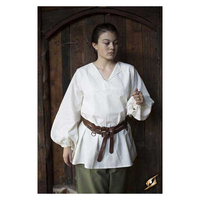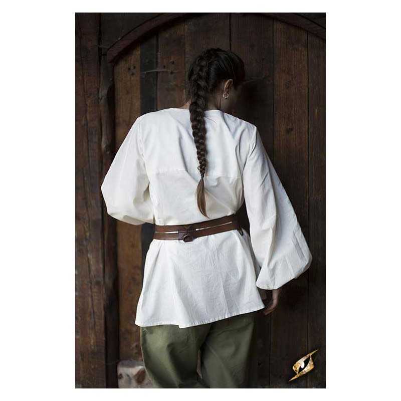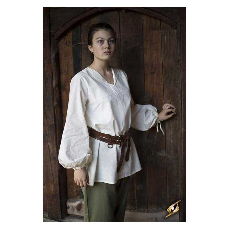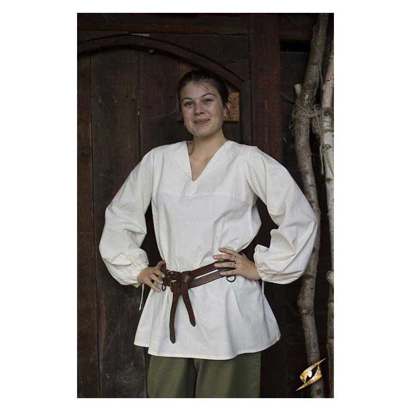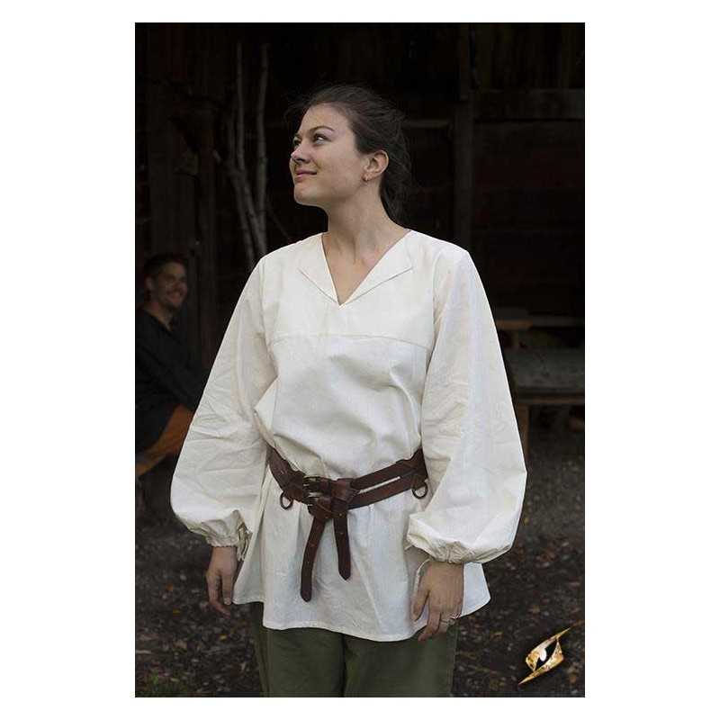 Epic Armoury's new Godfrey Shirt is a loose roguish garment made from light cotton and designed for both comfort and style. It falls just over the hip, and is fitted with a subtle collar along the v-neckline. The sleeves are designed to give a full, loose look befitting a wide range of social classes and careers from the late Middle Ages through the Renaissance. Tighten a cotton cord at the wrists to keep the fabric out of the way, made to easily fit inside a pair of gloves or gauntlets.