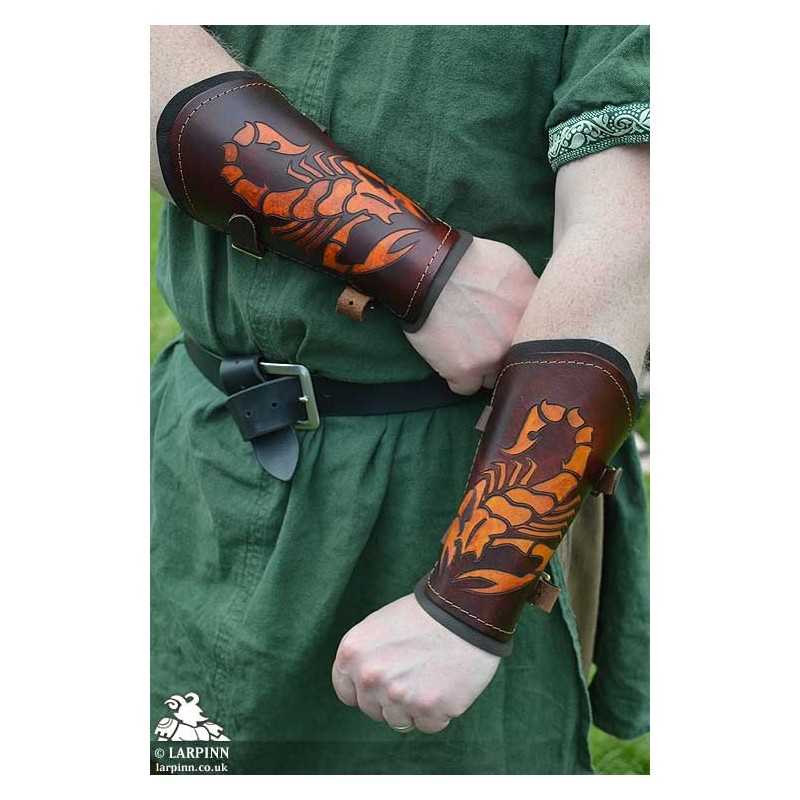These bracers are made from two layers. The top layer is high-quality veg tan leather, embossed with the design and hand-dyed. The back plate is made from soft suede to add comfort. The supple leather molds to the wearer's arms over time, ensuring a personalized fit for maximum mobility.