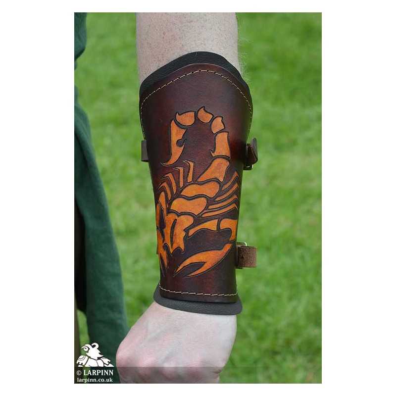These hand painted bracers are made at Larp Inn, in the UK. These bracers are etched and hand dyed by us, providing beautiful quality and a unique finish on every pair. The thicker leather used on the top layer makes them perfect for 'Medium Armour Use' at most LARP Systems. However, the bracers work perfectly on their own. The calf suede finish on the inside is used for maximum comfort.