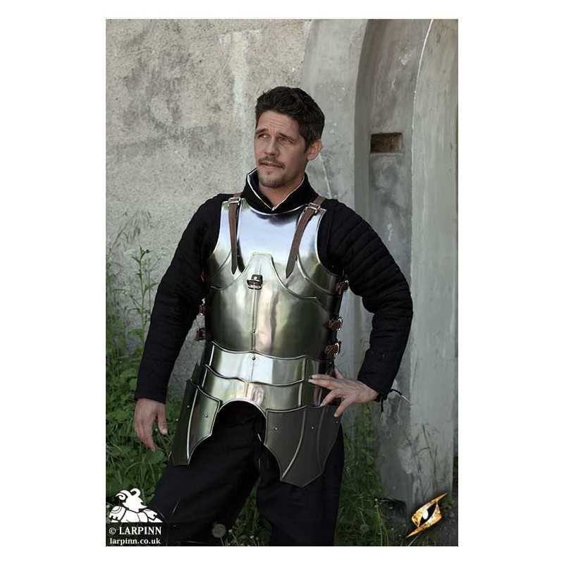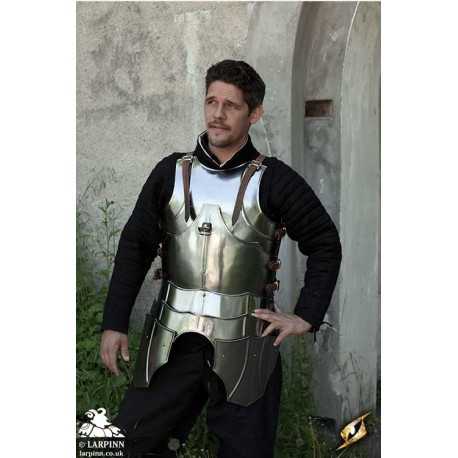 This bestselling armour is made for the upper crust of the battlefield, featuring front and backplates, faulds and tassets. The breast plate has a central crease and ridges around the rim. The armour is a close fit to the arms and throat to minimize the number of weak spots. The matching breast and backplates extend below the abdomen, connecting to the tassets beneath the protection of the faulds: a series of overlapping, modelled metal plates protecting the weak spots at the pelvis.