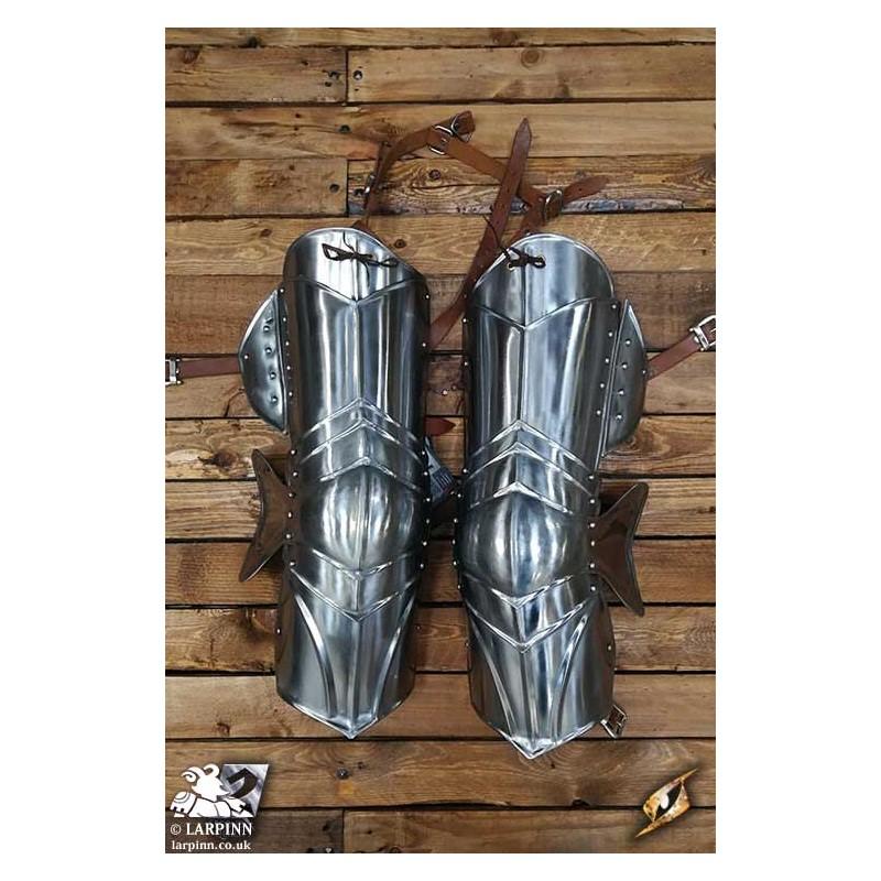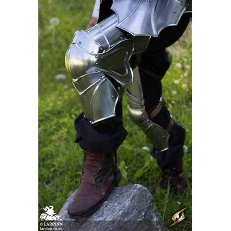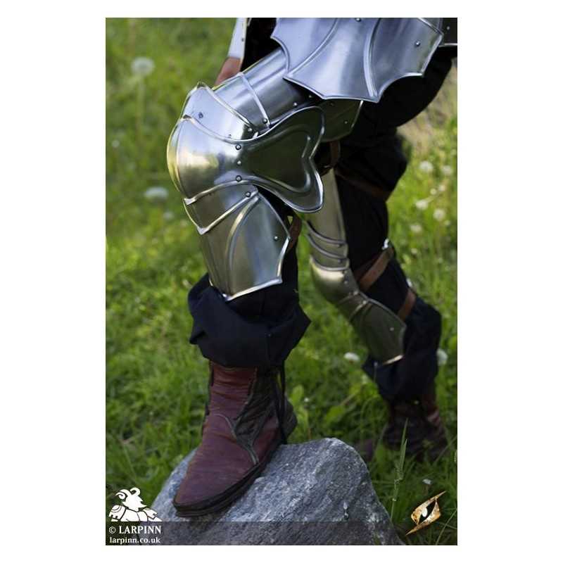 The Gothic Leg Protection consists of cuisses to protect the lower thighs, articulated poleyns covering the knees, and half demi-greaves protecting the upper shins and sides of the calves. The poleyon knee-cups are articulated, composed of four overlaying plates and fitted with a projecting heart-shaped plate adding cover to the notoriously under-protected hamstring. This armour piece is held up via straps tied to the wearer’s belt and held in place via guiding straps around the thighs and calves.