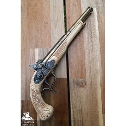 The 'Grande Replica Percussion / Flintlock Cap Pistol' is a richly decorated replica pistol with an ivory looking handle and a brass barrel. This makes a wonderful prop for LARP, theater, cosplay and Halloween, particularly for pirate and sailor characters.