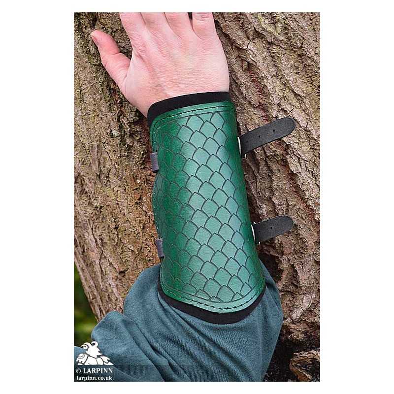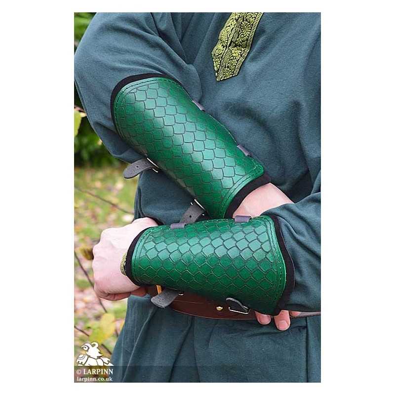 These bracers are made from two layers. The top layer is high-quality veg tan leather, embossed with the design and hand-dyed. The back plate is made from soft suede to add comfort. The supple leather molds to the wearer's arms over time, ensuring a personalized fit for maximum mobility.